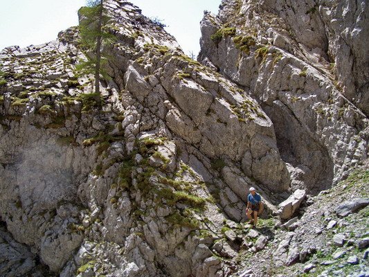 2. Über ein kleines Wandl auf Stufe und weiter gerade aufwärts zu Stand unter Kaminspalt (20m; 2)