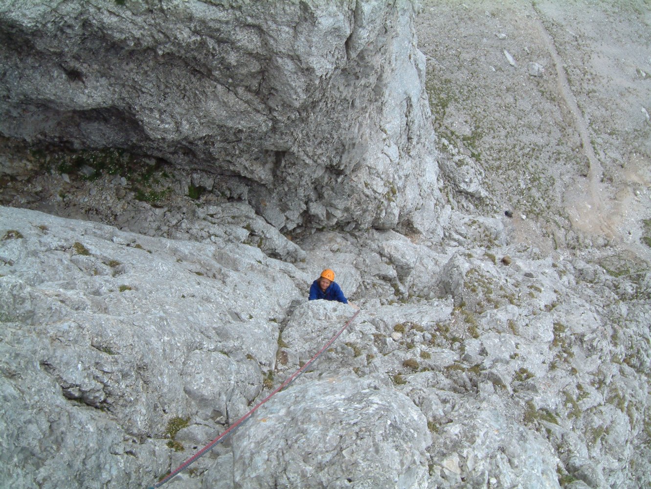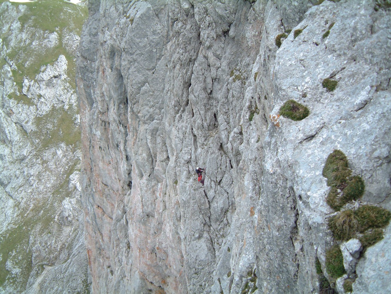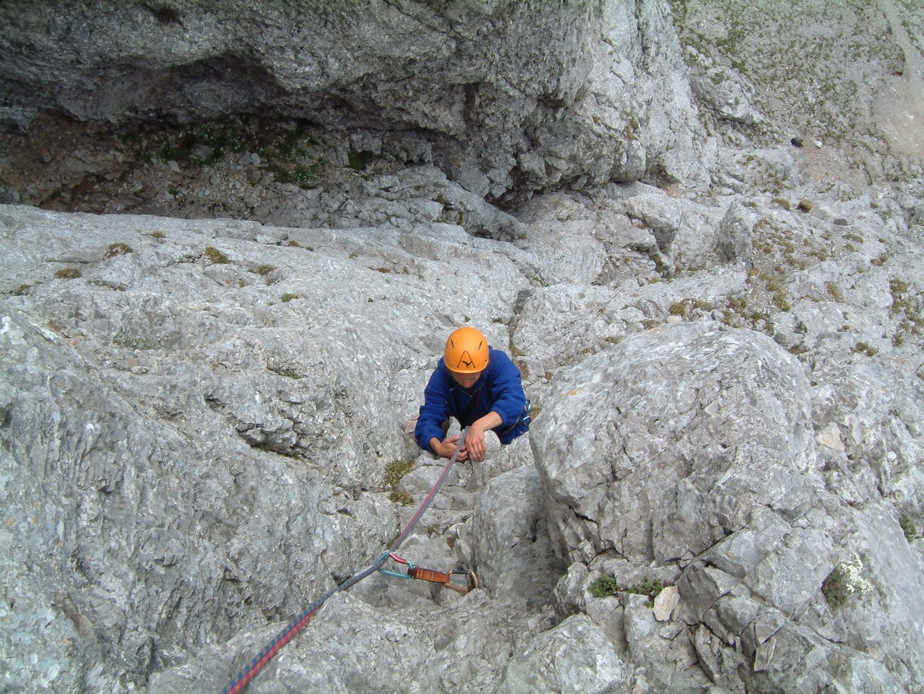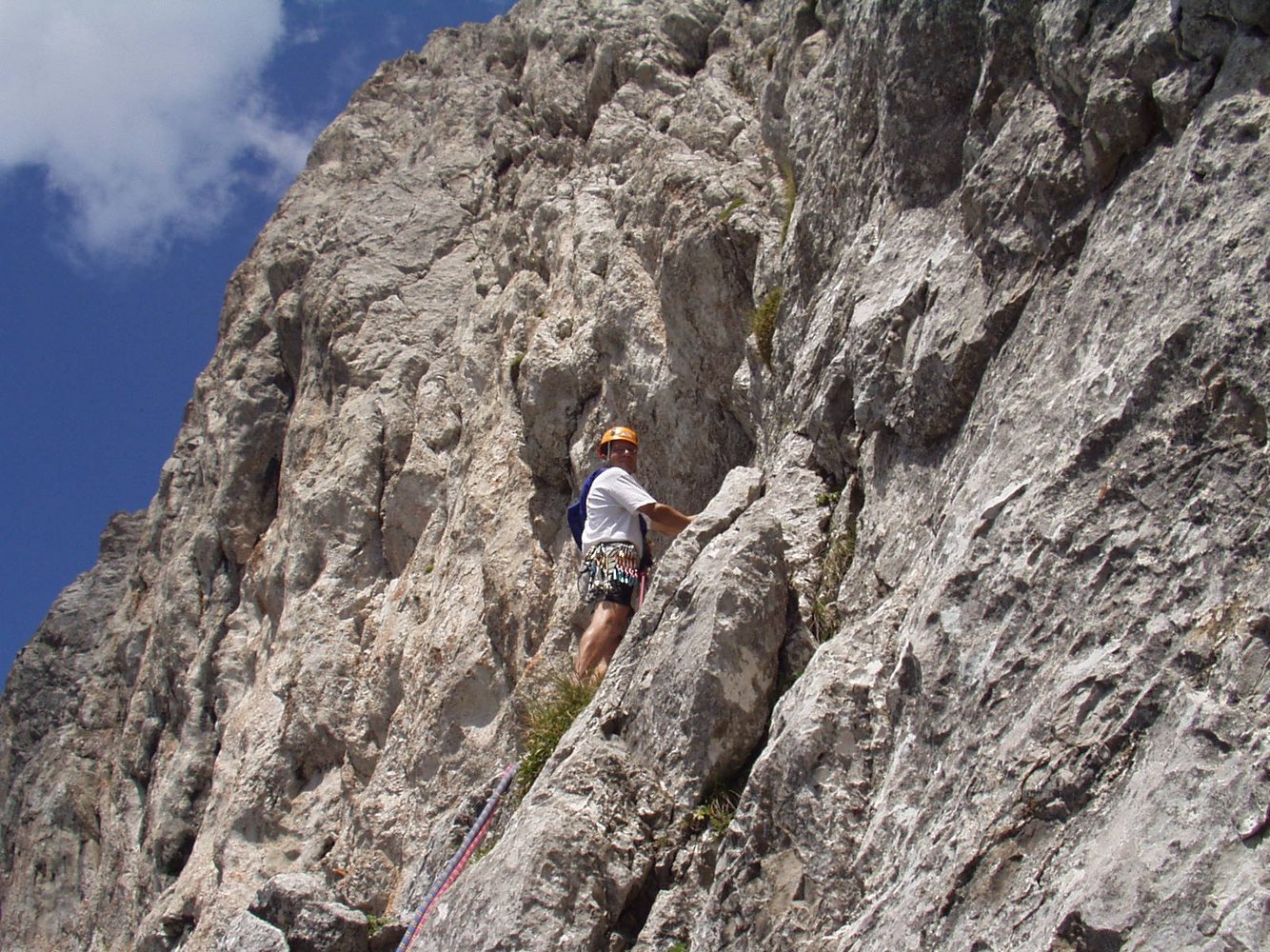 Schöne und sehr beliebte Tour. Sie durchquert die Westwand an ihrer leichtesten Stelle und bietet durchwegs anregende Kletterei in gutem Fels.
