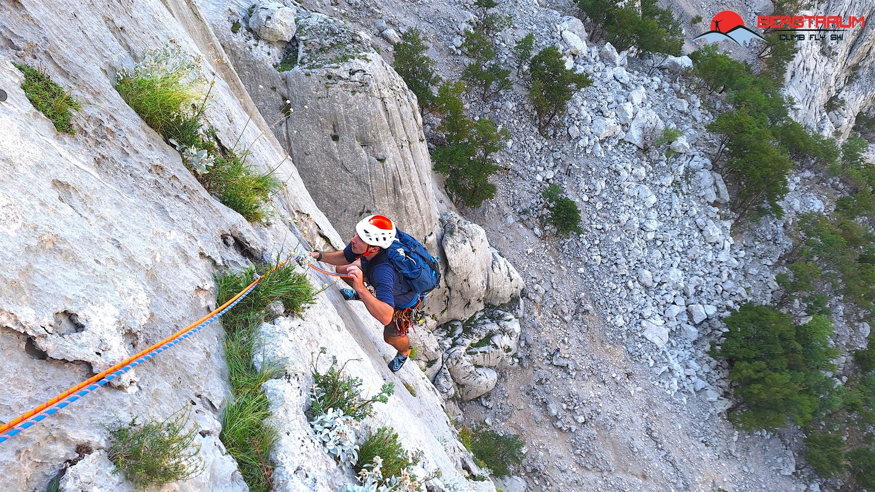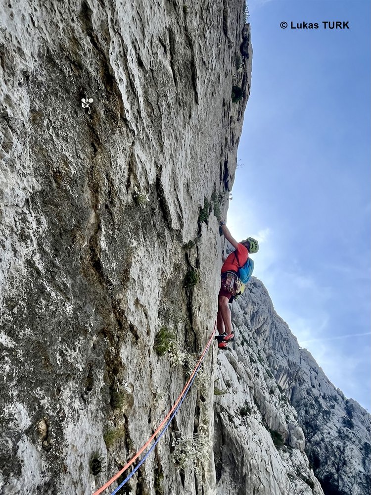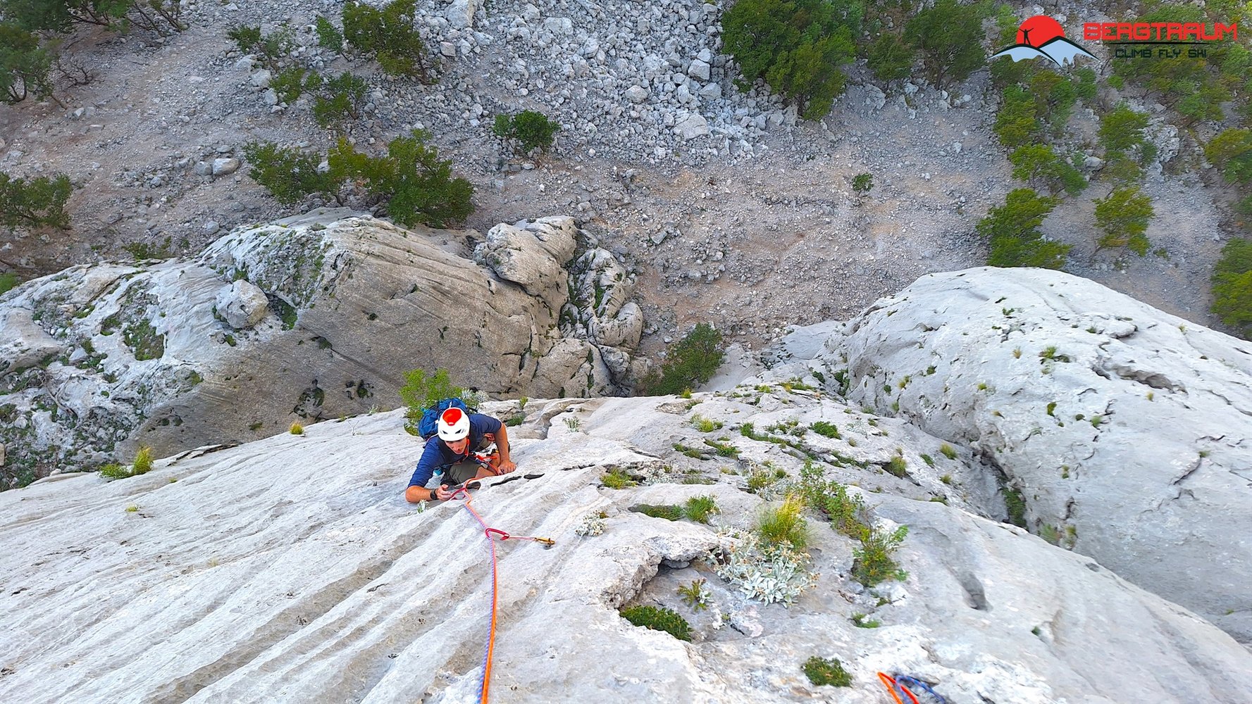Die „Pero“ ist eine wunderbare Tour auf den „Elefantenrüssel“ am Stup. Die pero zieht unmittelbar rechts neben der „Karabore“ und der „Walter Wolf“ gerade nach oben. Perfekt für den ersten Tag oder auch zum Ausklettern am Ende des Tages. Herrlicher Fels mit abstrakt und filigran wirkenden Schuppen, die oft hohl klingen- Trotzdem höchster Klettergenuss!