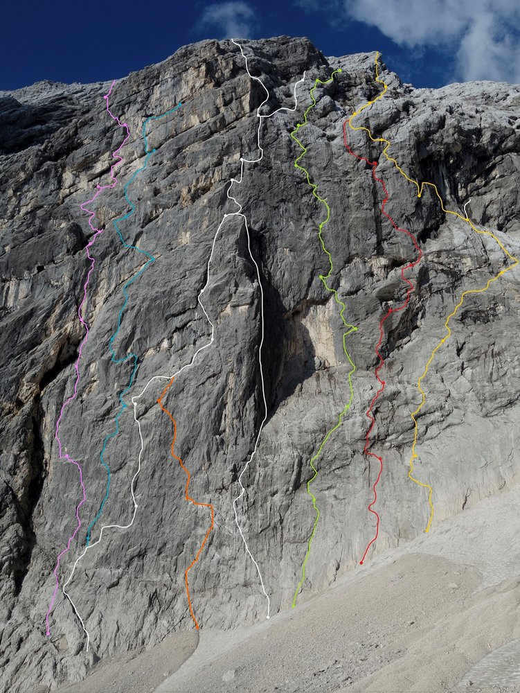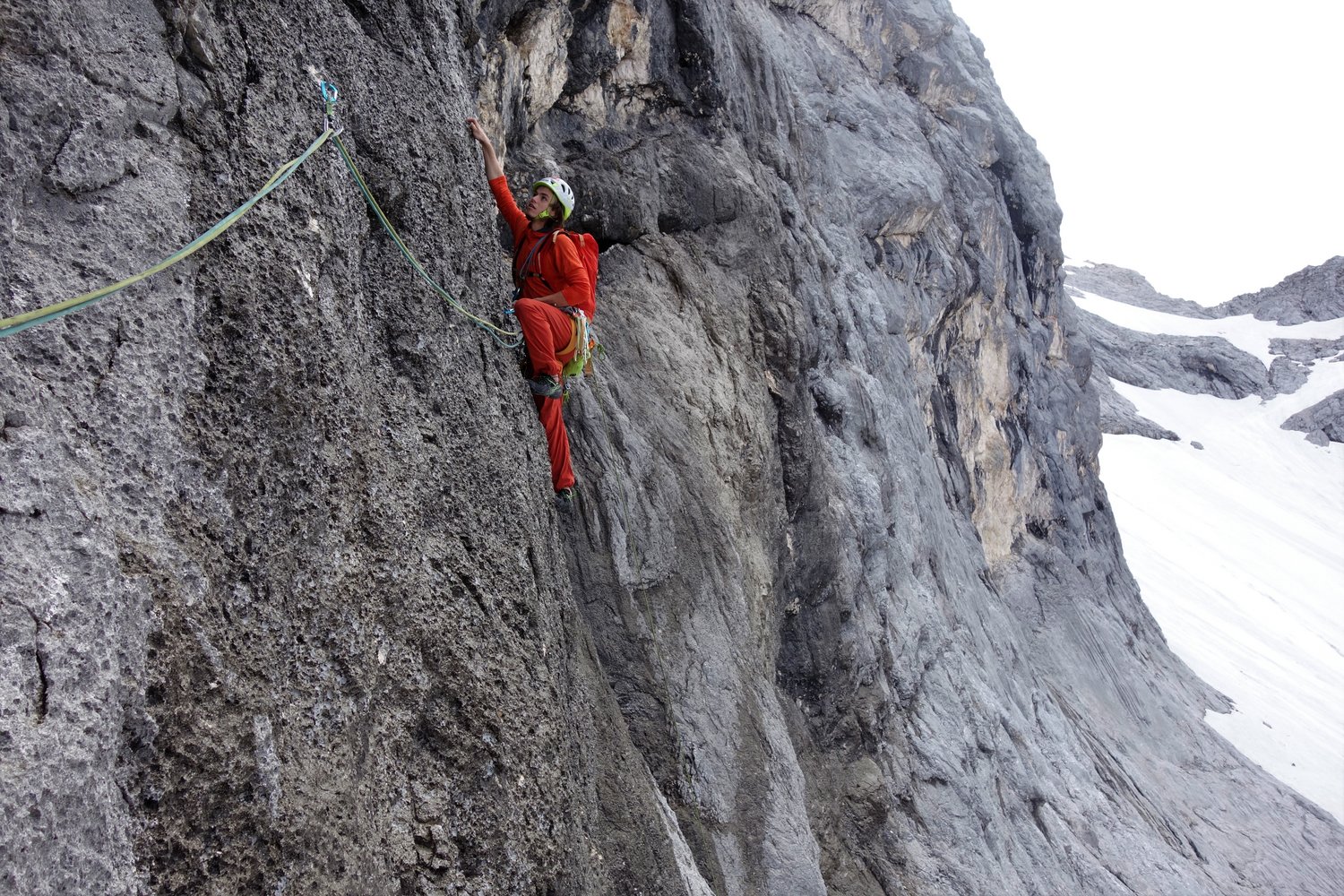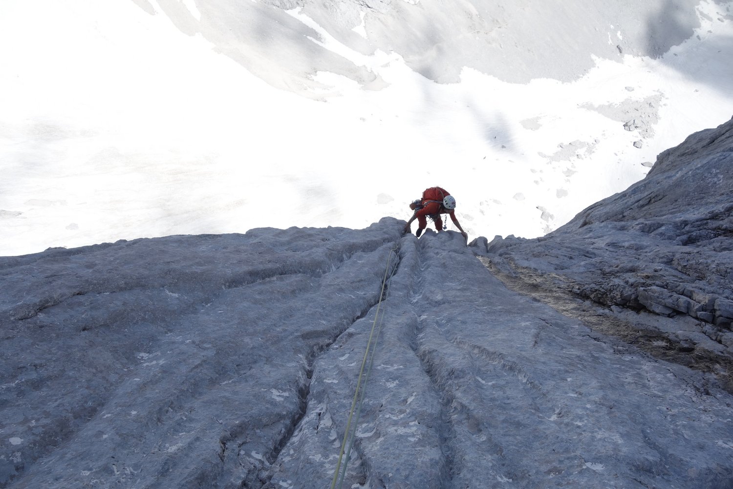 Die einfachste und längste Möglichkeit diese Wand zu durchsteigen erinnert bei der Felsqualität und Linienführung im unteren Teil an Grill-Routen am Gardasee. Nur ohne mediterranes Gestrüpp. Durch einige nachträglich gesetzte Haken sollte auch der alpin versierte Sportkletterer ohne andauernd zu betreibende Risikoanalyse Spaß haben können. Der obere Teil ab dem Wandbuch ist etwas alpiner mit etwas großzügiger Linienführung in manchmal auch brüchigem 3er Gelände, soll im Anspruch aber ähnlich bleiben.