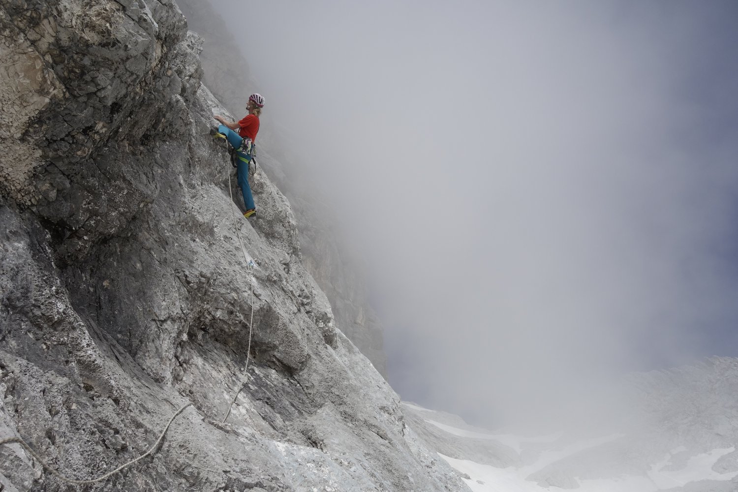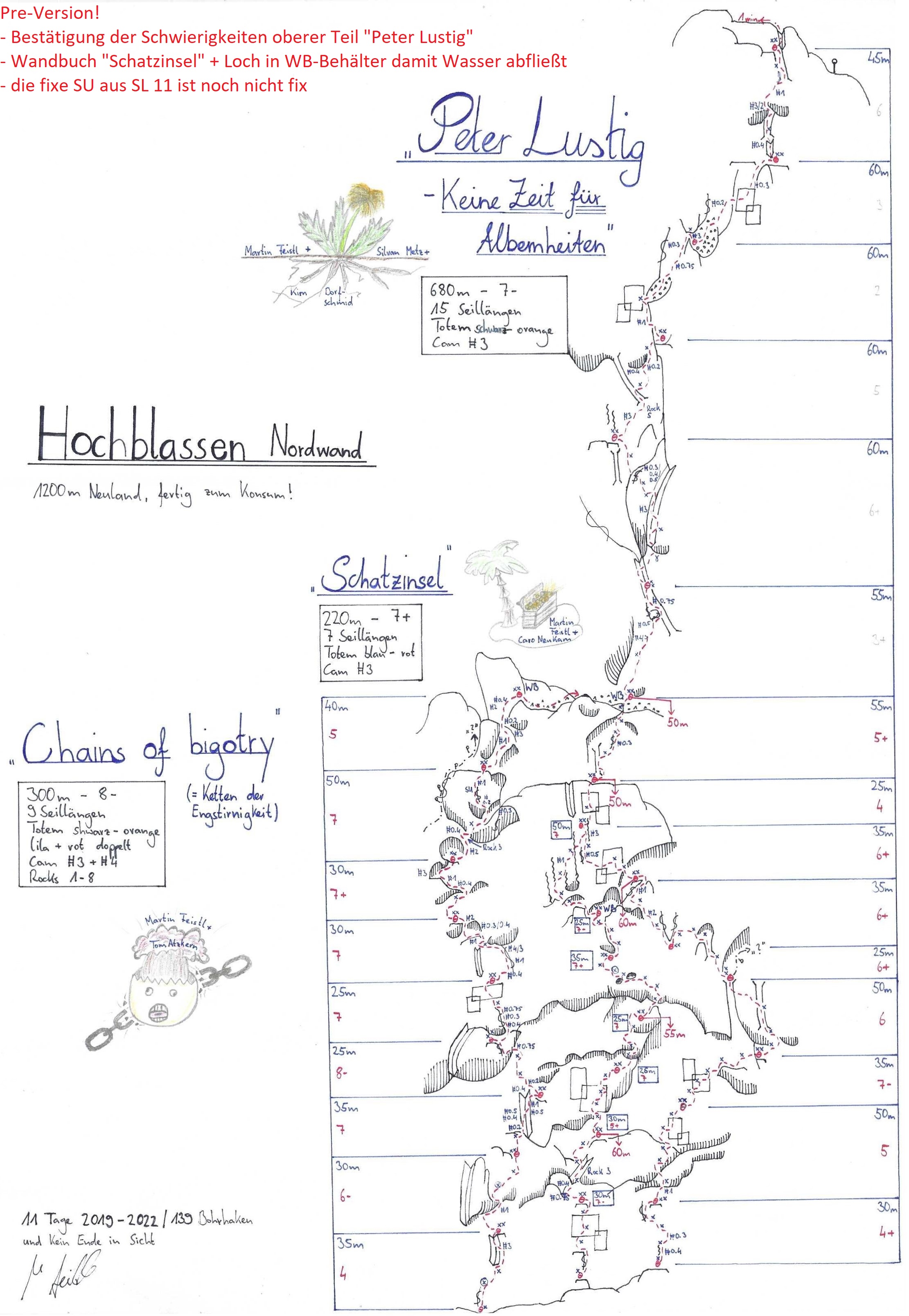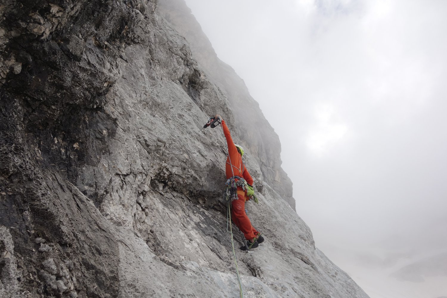 Die einfachste und längste Möglichkeit diese Wand zu durchsteigen erinnert bei der Felsqualität und Linienführung im unteren Teil an Grill-Routen am Gardasee. Nur ohne mediterranes Gestrüpp. Durch einige nachträglich gesetzte Haken sollte auch der alpin versierte Sportkletterer ohne andauernd zu betreibende Risikoanalyse Spaß haben können. Der obere Teil ab dem Wandbuch ist etwas alpiner mit etwas großzügiger Linienführung in manchmal auch brüchigem 3er Gelände, soll im Anspruch aber ähnlich bleiben.
