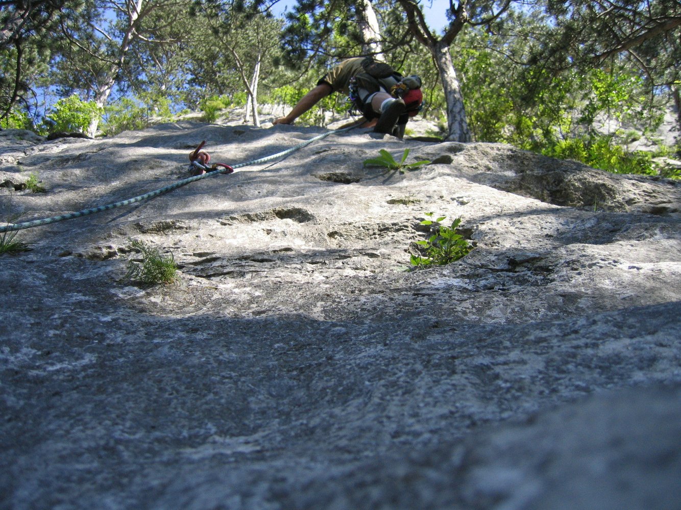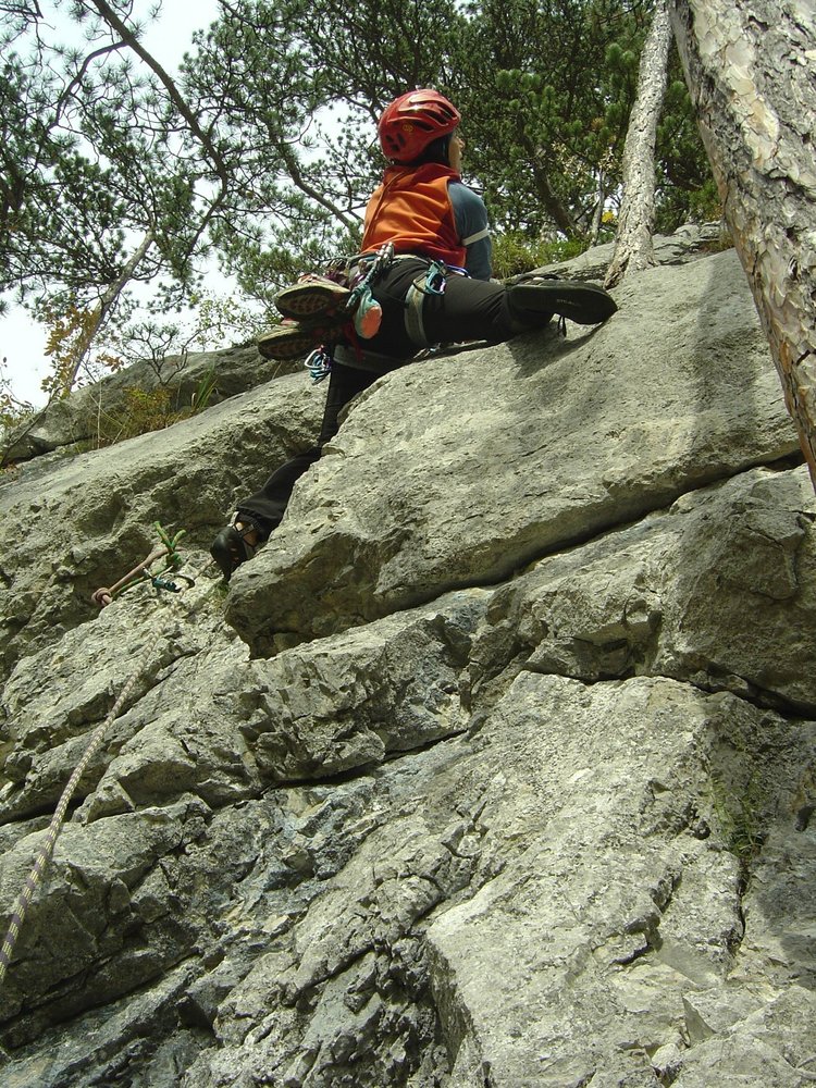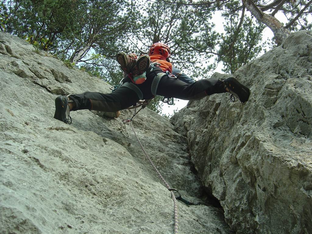 Diesen Tipp bekamen wir von einem Freund der meinte, diese Tour dürfte bei uns nicht fehlen. Und wirklich, dass was die Erstbegeher da "ausgegraben" haben kann sich sehen lassen. Eine schöne Route, bei der das Klettern zur Freude wird, zieht in 5 Seillängen die Plattenwand hoch. Schon am Einstieg (ist mit roter Farbe angeschrieben) lässt sich abschätzen, was einen erwartet. Die erste Seillänge mit den vielen Sanduhren sieht fantastisch aus. Und das Ganze ist nur 4+ schwer, man glaubt es kaum. Der Rest, die folgende Verschneidung und die Plattenseillängen, stehen dem um nichts nach. Wie auch für die anderen Routen in diesem Bereich gilt die erhöhte Steinschlaggefahr, also unbedingt Helm mitnehmen (und auch aufsetzen, vor allem im Einstiegsbereich).