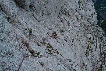 Kommentar Hubert Wolf: In der 12. Seillänge ist es auf jeden Fall günstiger vom Standplatz die rechte Variante zu nehmen und sogar auf Leiste noch 5 m weiter nach rechts (Bohrhaken) und gerade hinauf zu Stand - Schwierigkeit 3+ max. 4-. Der Originalweg in den Verschneidungsgrund und dann rechts hinaus ist wesentlich schwieriger und oft nass. Ausserdem lauert in der Ecke ein brüchiger Block. Im Mittelteil der Tour gibt es bei Nässe die Möglichkeit etwas rechts in die Platten auszuweichen (unwesentlich schwieriger). Der Überhang in der letzten SL ist mit 4- etwas streng bewertet. Vom Standplatz nach der 8. SL (Verh.) kann man ev. relativ leicht zum leichteren oberen Teil der Planspitze NW Wand ausqueren.