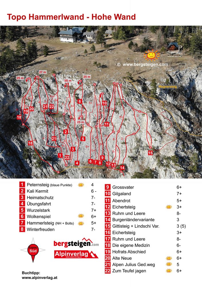 Interessante zwei Seillängen Routen im linkesten Teil der Hammerlwand, die sehr gut als Aussstiegsvariante des Eichertsteiges geklettert werden kann. Alterntiv erreicht man den Einstieg durch 2x35 m absteilen über die Hammerlwand.