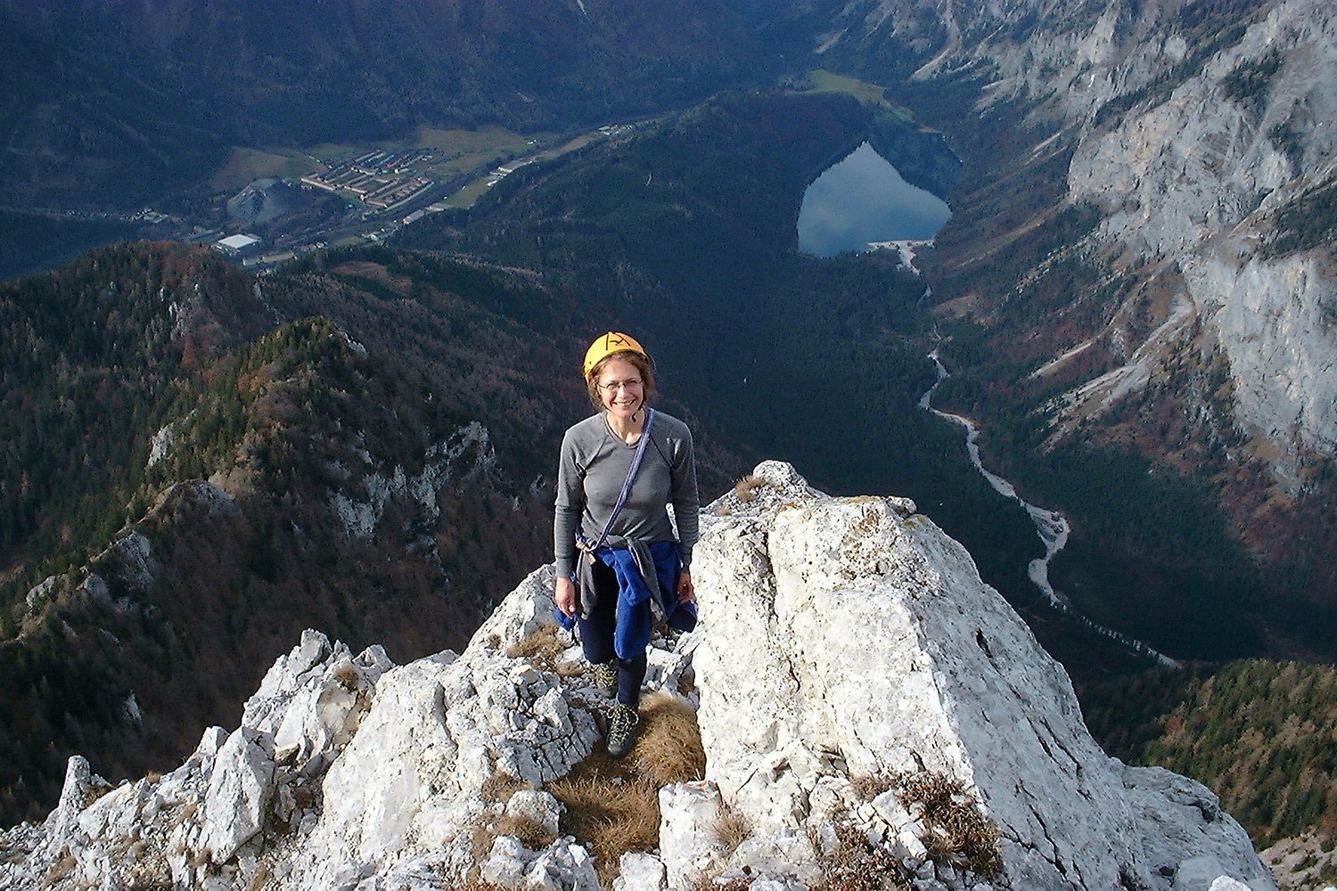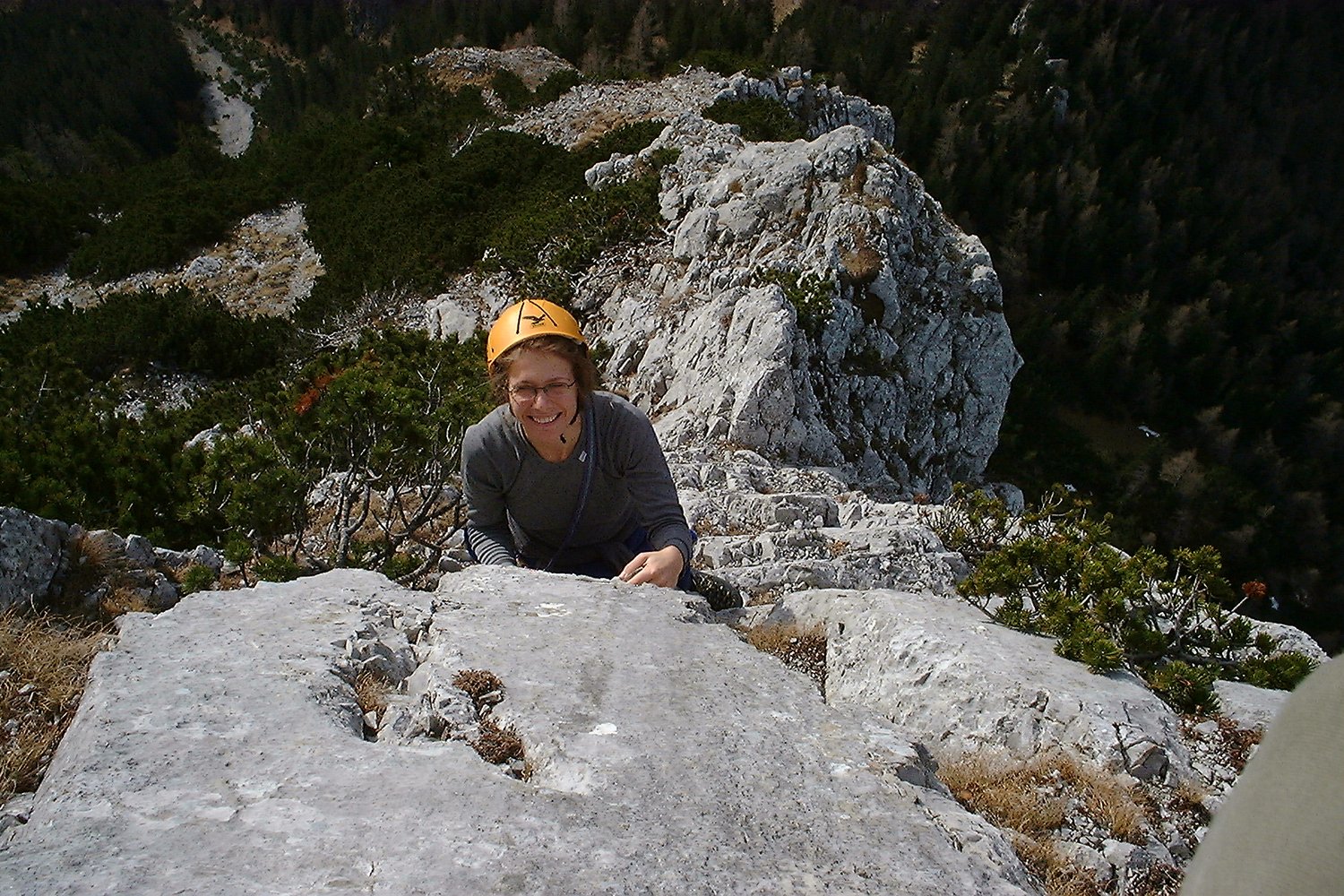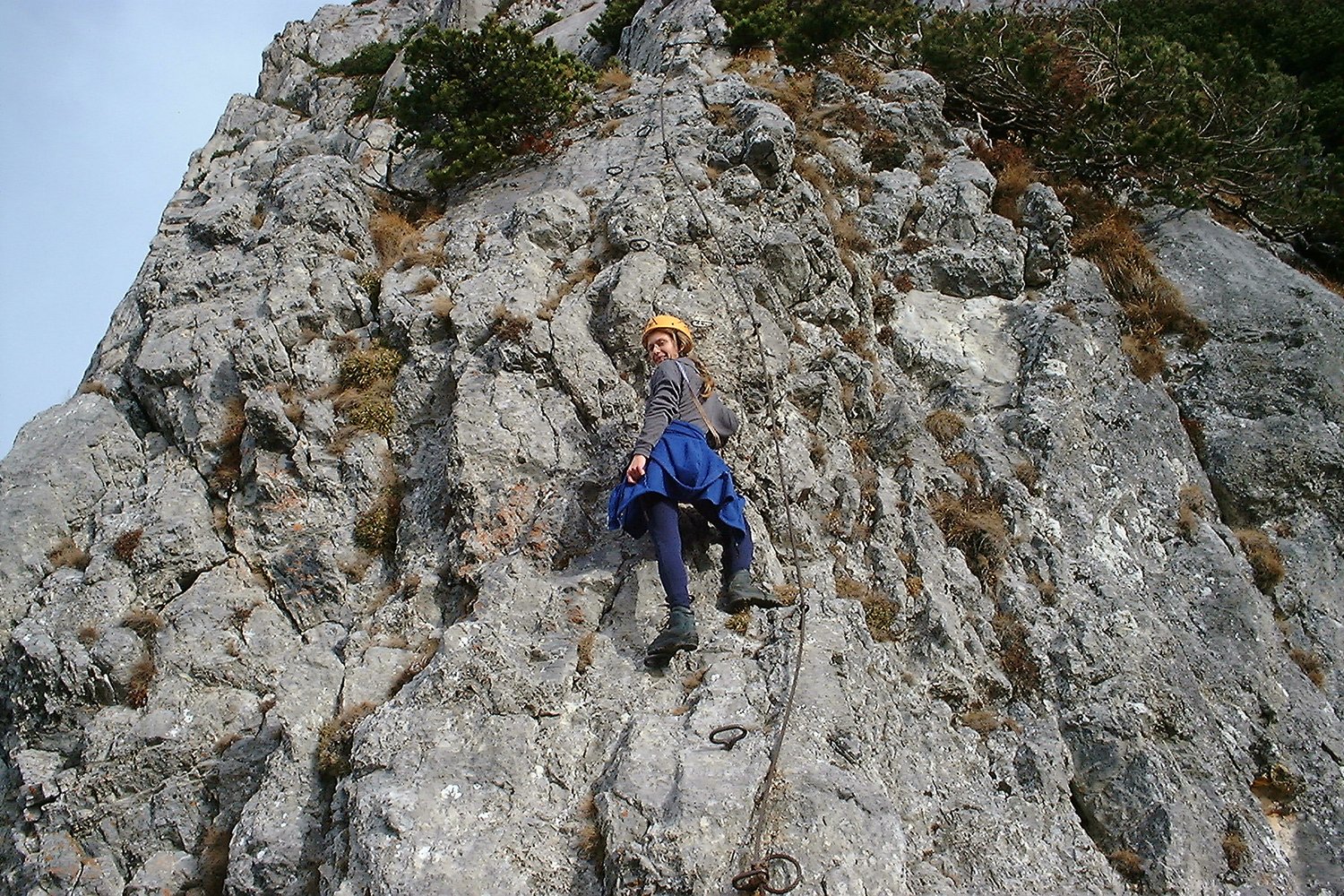 Leichte Kletterei mit kurzem Klettersteigstück und besonders schönen Ausblicken. Ab den Hubschrauber-Landeplatz gerade über einen Felsrücken (1+) zum kurzen versicherten Stück. Über Klammern endlang des Stahlseils ca. 20Hm an der Pfeilerkante hinauf (B-C), die darauffolgende Latschengasse ist ebenfalls versichert (A). Hinter der Latschengasse das Schlüsselstück: senkrechte Wand mit guten Tritten und guter Häckelleiste (etwa 10Hm 3-) - auch mit Bergschuhen leicht zu machen!. Hinter der Schlüsselstelle möglichst am herrlichen Grat emporsteigen - tolle Blicke auf die umliegenden Berge und den Leopoldsteinersee! Immer direkt auf dem Grat (meist 1-2, teilweise 2+) bis ein markantes flaches Gratstück erreicht ist, wo der Originalweg der vor einem liegenden Wand nach links ausweicht.