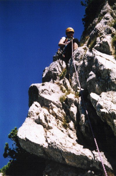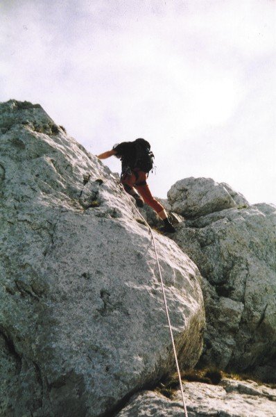 Andreas Riesner 29.8.2004: Die Route über den Westgrat ist jetzt bis auf den obersten Abschnitt der original Linie durch die breite Rinne unter dem Gipfel komplett mit Bohrhaken ausgestattet.