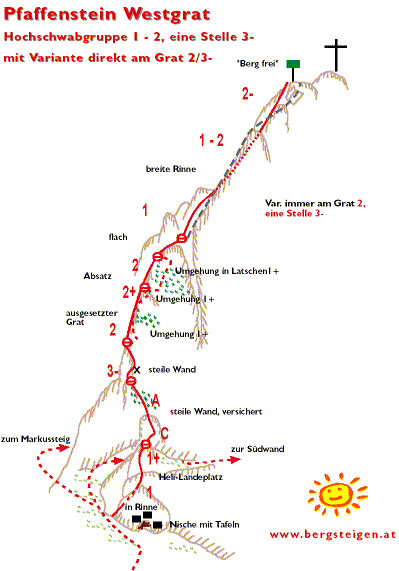 hier gibt es mehrere Möglichkeiten: will man nicht den gleichen Weg zurückgehen (Markussteig) überquert man das Pfaffenstein Plateau (ab dem Gipfelkreuz R. Osten, ca 30 min) und steigt über den Südwandsteig ab (B, versichert, teilweise Eisenleitern und Stifte, Vorsicht: Steinschlag!, beginnt an der niedrigsten Stelle des Plateaus rechts). So ergibt sich eine schöne Rundtour (Abstieg etwa 2 Std, 1050 Hm). Weiters: Abstieg über den Markussteig (wie Zustieg) oder über den Westgrat selbst (nicht so zu empfehlen wegen des Gegenverkehrs).