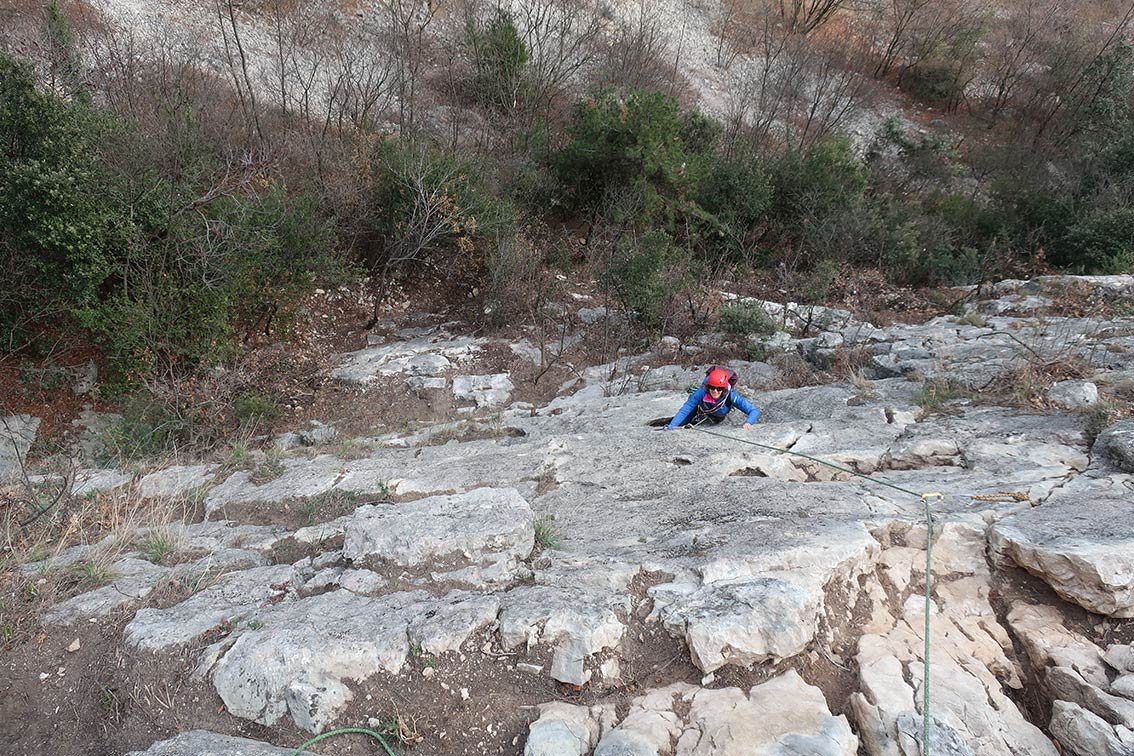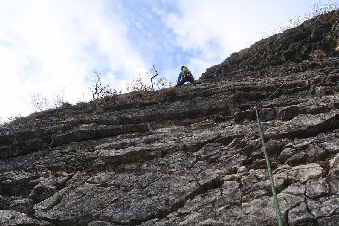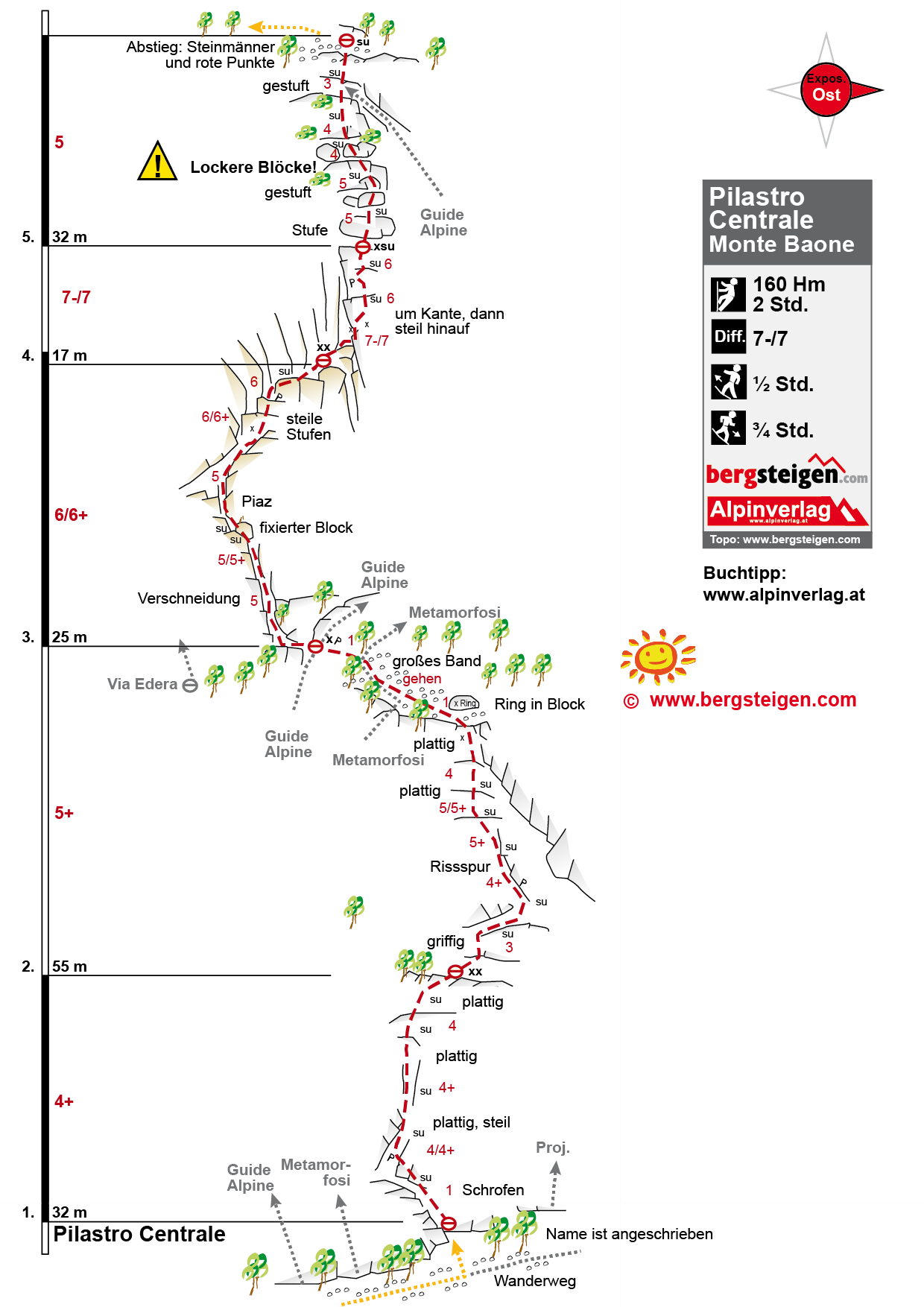 Die Route Pilastro Centrale ist eine der schweren Routen aus dem Hause Kluckner am Monte Baone. Unten klettert man über steile Platten, schwerer und anspruchsvoller als in den leichteren Touren links davon; oben dann eine schwere, leicht überhängende Kante, welche am Ende bewältigt werden muss. Die Absicherung ist an den schweren Passagen gut (an der Schlüsselstelle 2 Bohrhaken im Meterabstand), den 5ten Grad sollte man aber solide klettern, dort sind teilweise recht weite Abstände. Diese Abenteuertour stellt aber eine schöne Bereicherung für den Monte Baone dar, damit hat der 7er-Kletterer auch etwas zu tun.