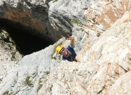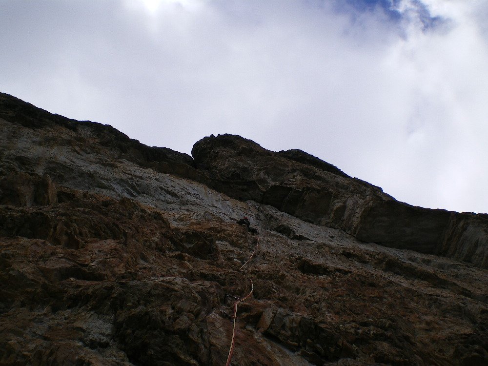 Vom Einstieg die Rissverschneidung hinauf, dann markant nach rechts rüber zu steilem Riss. Diesem folgen bis zum ersten Band. Zwei Seillängen rauf unter das erste Dach. Luftig drüber und weiter über einen Riss und dem zweiten Dach zum Band unter dem Maultierrücken. Diesen unverfehlbar hinauf (geht auch A0). Am Ende einer darauf folgenden markanten, großen Verschneidung geht’s nun rund 20 m schräg rechts aufwärts (mehrere SU) und dann fast waagrecht nach links zum Ausstieg. Von dort in leichtem Gelände für ca. 100 HM (SG max. 3) zum Ende der Tour.