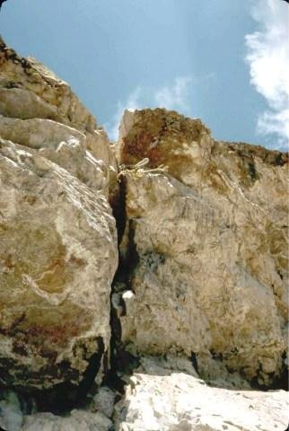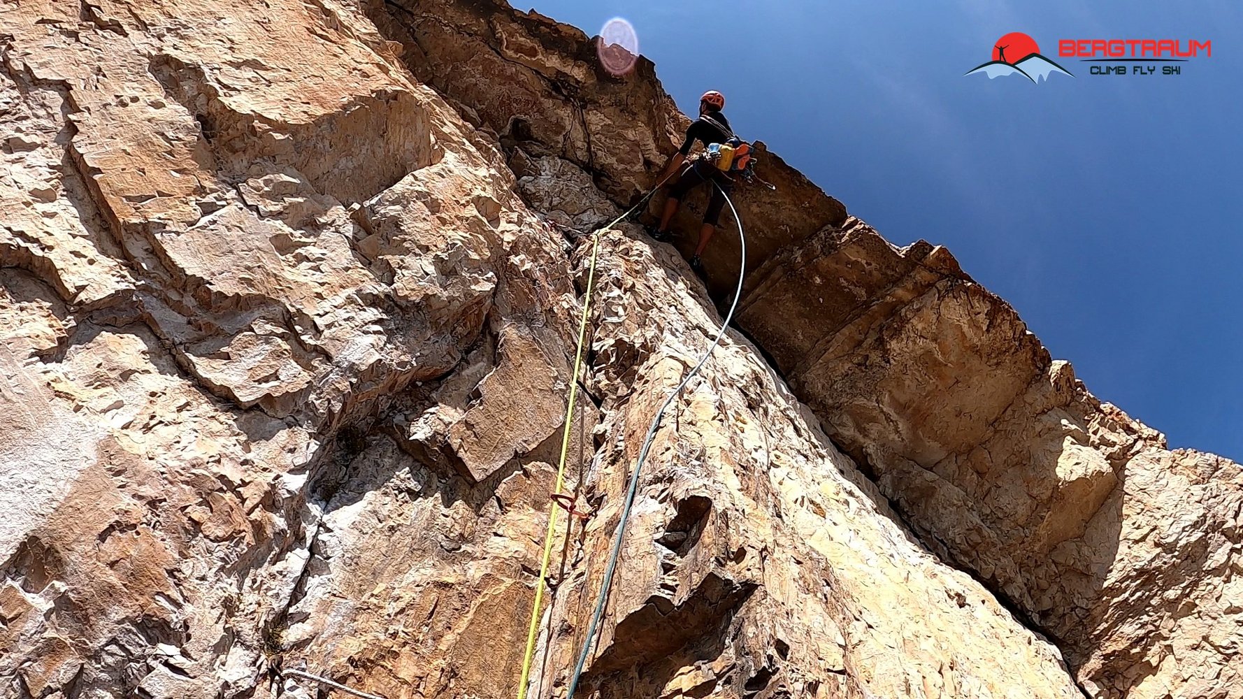 Anmerkung: Kurz unterhalb des Ausstiegs unter der gelben headwall im graufarbigen Vierergelände links raus. Ansonsten seid ihr zu hoch.