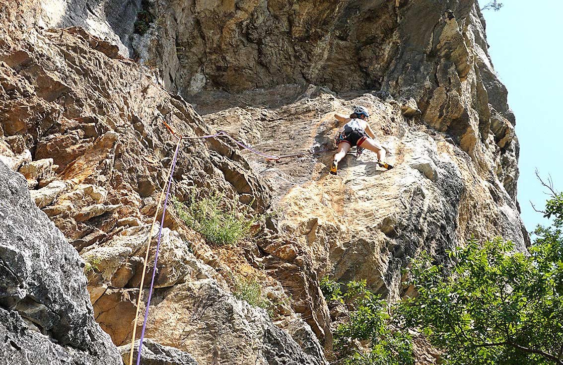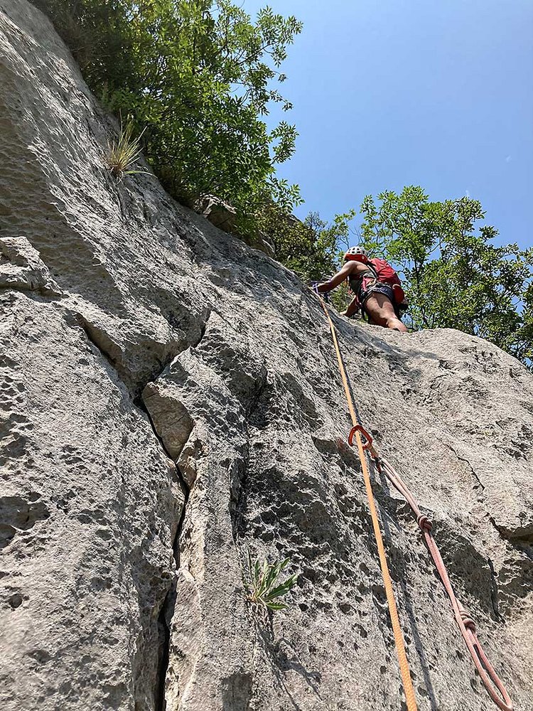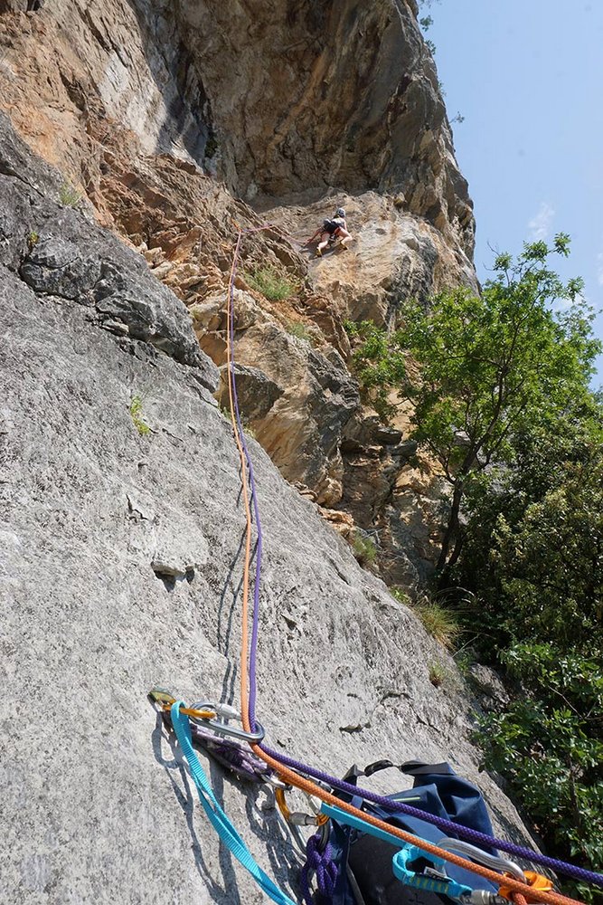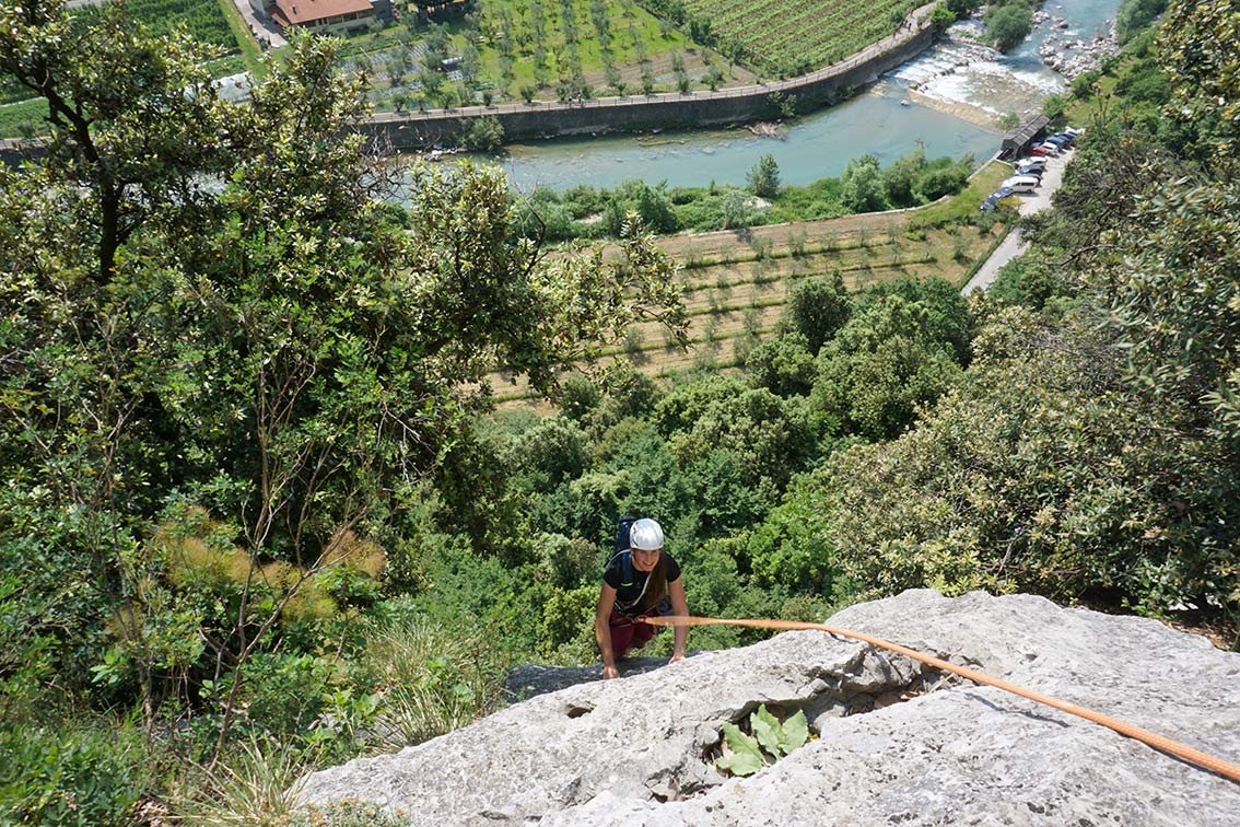 Die Via Pilastro Themis ist eine recht homogene und kühne Route an den San Paolo Felsen bei Arco. Im Mittelteil wird geschickt eine große Dachzone im Zickzack durchklettert - ein echtes Highlight! Wer sich im sechsten UIAA-Grad sicher fühlt, sollte sich diese traumhafte Klettertour unbedingt einmal anschauen.