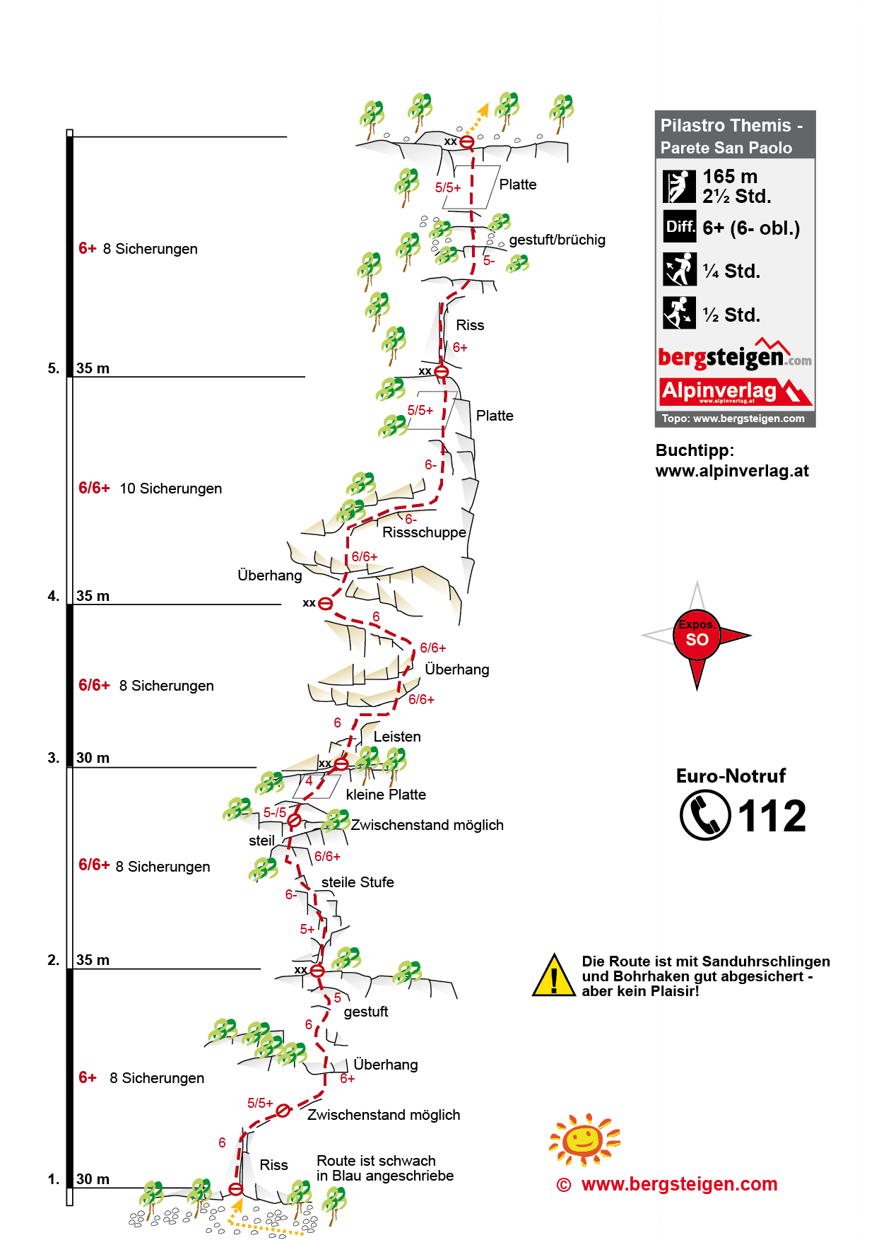 Recht durchgehend mit Passagen 6+ und 6 - der Vorsteiger sollte genügend Erfahrung in diesem Schwierigkeitsgrad haben.