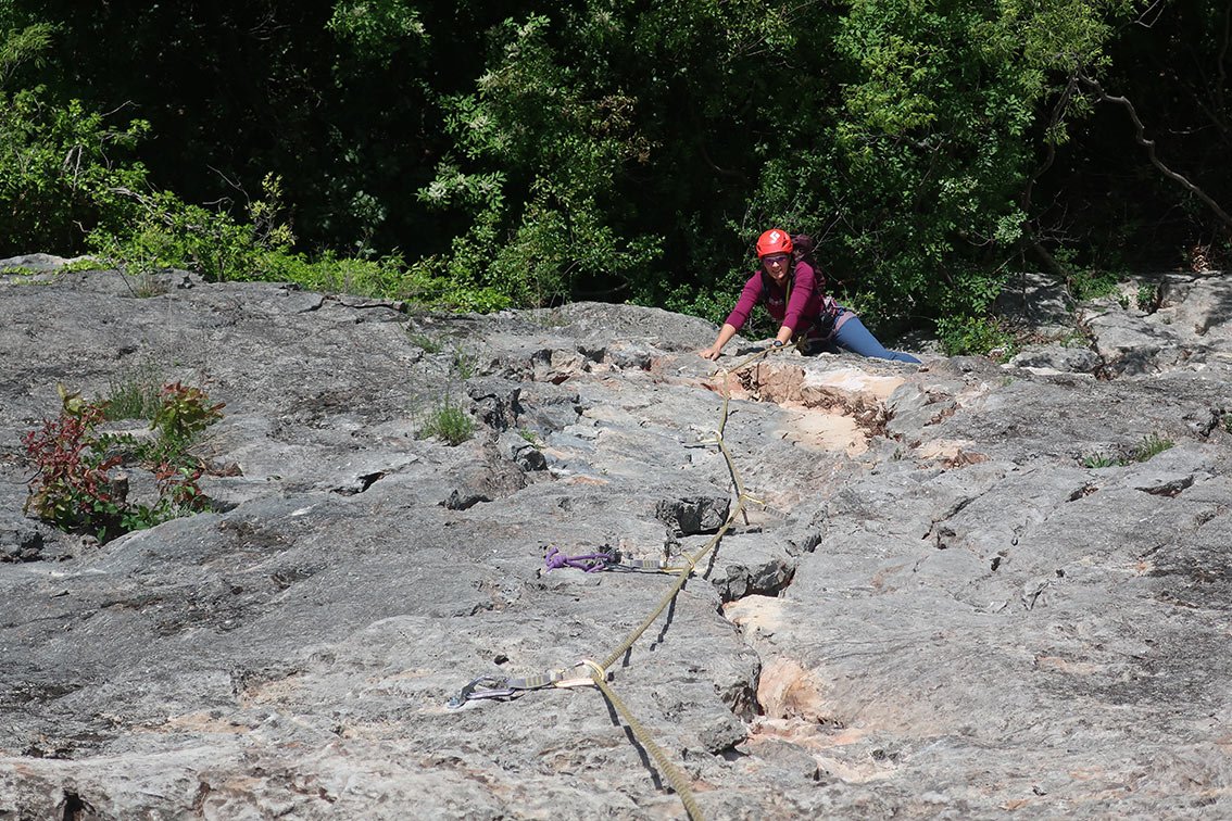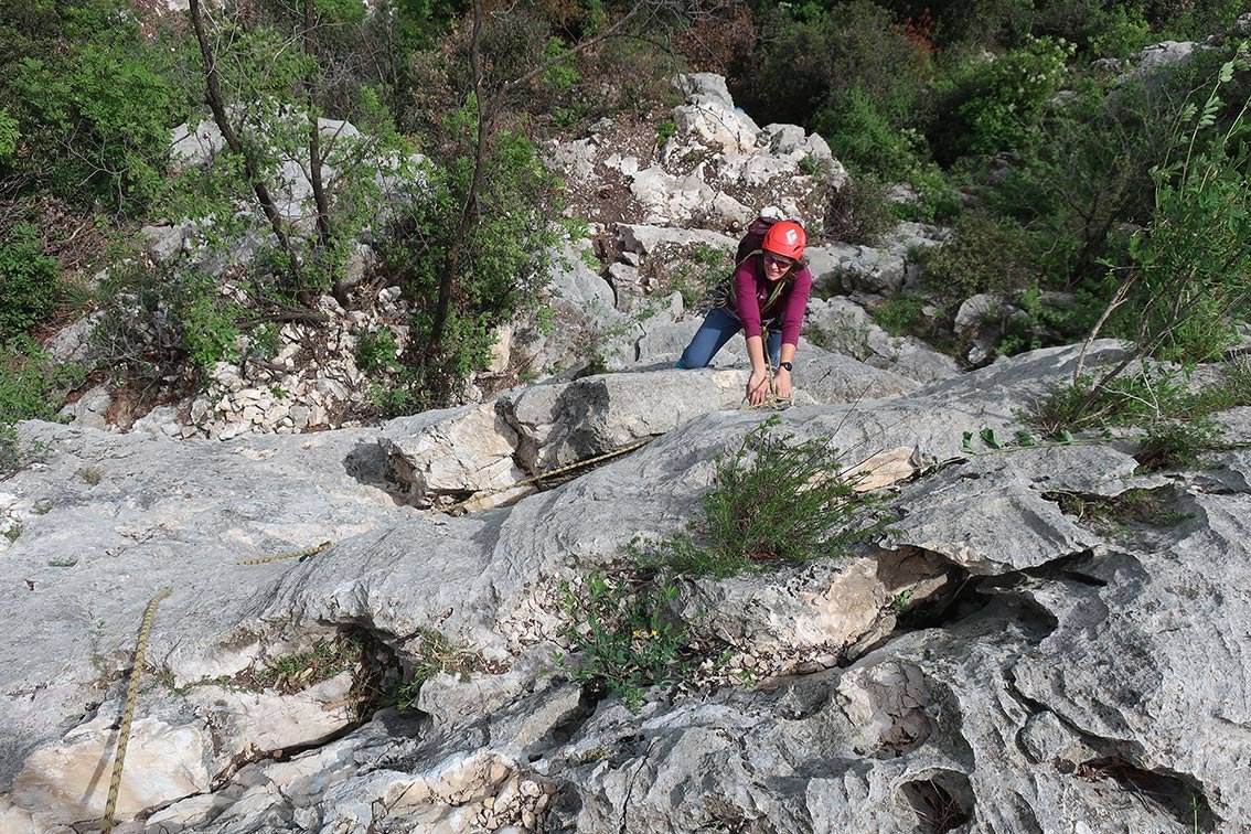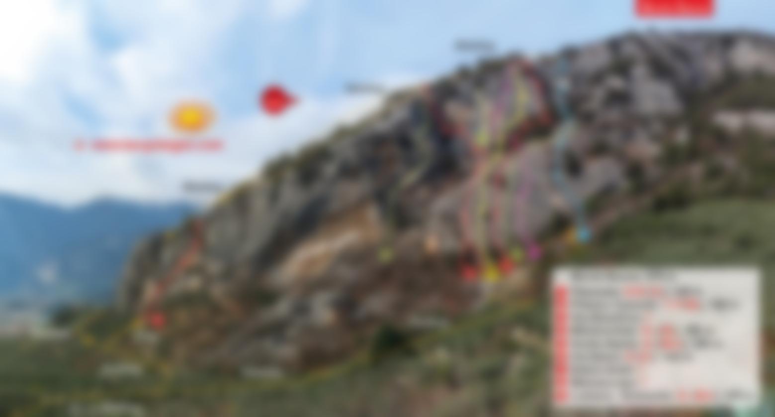 Siehe Topo. Die kurzen schweren Passagen sind zu Beginn und an den beiden Abschlussseillängen.