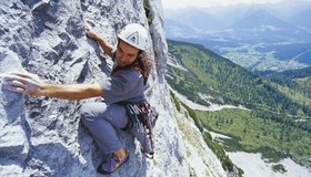 50 m Doppelseil (60 m Doppelseil von Vorteil fürs Abseilen) ; 8 Expr.-, 3 SU-Schl., KK-Sortiment inkl. Friends ; Standplätze mit doppelten BH bzw. Bügel.