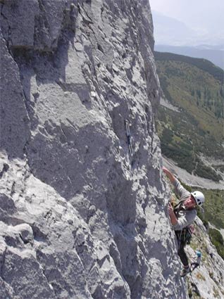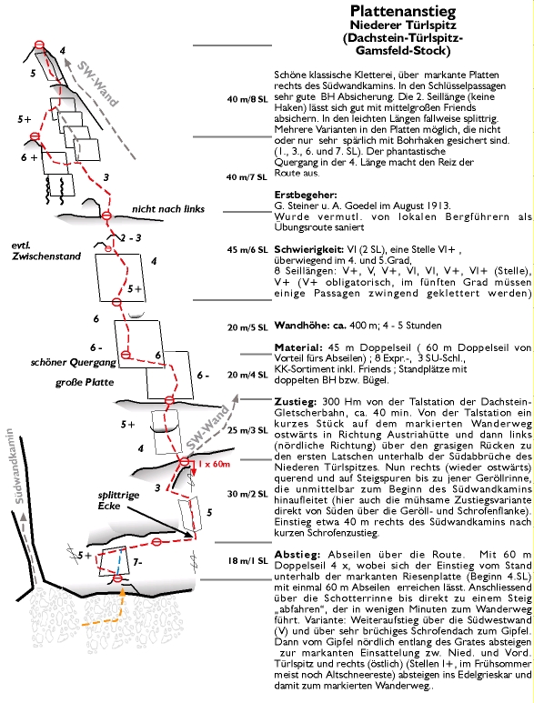 Schöne klassische Kletterei, über markante Platten rechts des Südwandkamins. In den Schlüsselpassagen sehr gute BH Absicherung. Die 2. Seillänge (keine Haken) lässt sich gut mit mittelgroßen Friends absichern. In den leichten Längen fallweise splittrig. Mehrere Varianten in den Platten möglich, die nicht oder nur sehr spärlich mit Bohrhaken gesichert sind. (1., 3., 6. und 7. SL). Der phantastische Quergang in der 4. Länge macht den Reiz der Route aus (siehe Fotos).