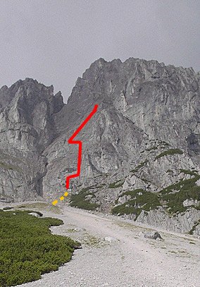 300 Hm von der Talstation der Dachstein-Gletscherbahn, ca. 40 min. Von der Talstation ein kurzes Stück auf dem markierten Wanderweg ostwärts in Richtung Austriahütte und dann links (nördliche Richtung) über den grasigen Rücken zu den ersten Latschen unterhalb der Südabbrüche des Niederen Türlspitzes. Nun rechts (wieder ostwärts) querend und auf Steigspuren bis zu jener Geröllrinne, die unmittelbar zum Beginn des Südwandkamins hinaufleitet (hier auch die mühsame Zustiegsvariante direkt von Süden über die Geröll- und Schrofenflanke). Einstieg etwa 40 m rechts des Südwandkamins nach kurzen Schrofenzustieg.