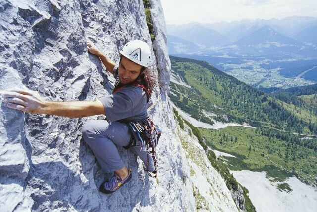 50 m Doppelseil (60 m Doppelseil von Vorteil fürs Abseilen) ; 8 Expr.-, 3 SU-Schl., KK-Sortiment inkl. Friends ; Standplätze mit doppelten BH bzw. Bügel.