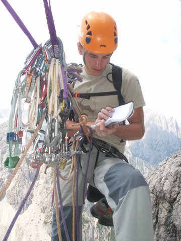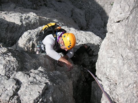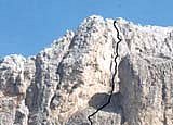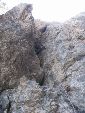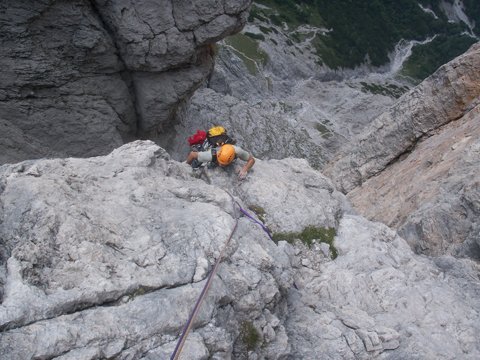 7te SL.: vom Stand gerade höher in Kamin mit großer Nische (brüchig), dann rechten Riss folgend (Schlinge) weiter, später nach links zu Stand bei Köpfl.