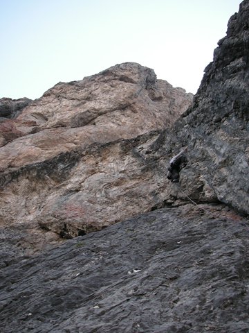 9te SL.: wieder leicht rechts den Riss verfolgend höher, es wird der direkte Ausstieg der "Südwestwand" gekreuzt, über leichten Überhang (griffig) hinauf und über geneigte Platten bis zum Stand bei großen Block (ein BH und Schlinge).