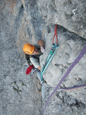 8te SL.: leicht rechts über seichten Riss weiter, nach ca. 25 m wieder Stand bei Köpfl.