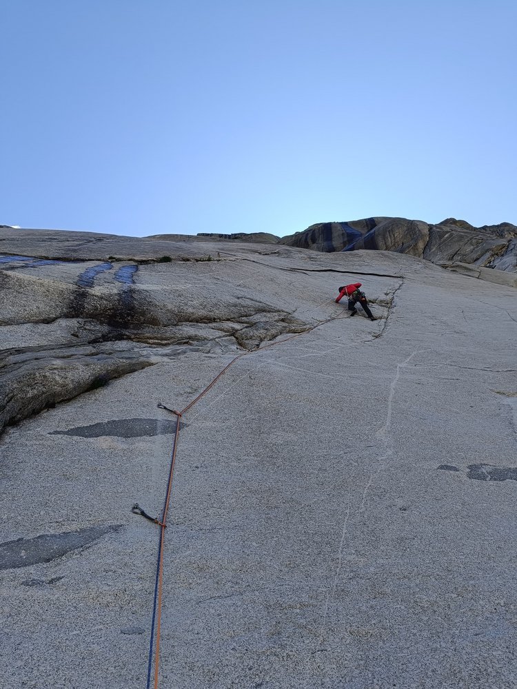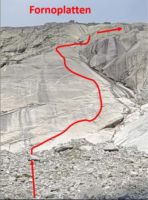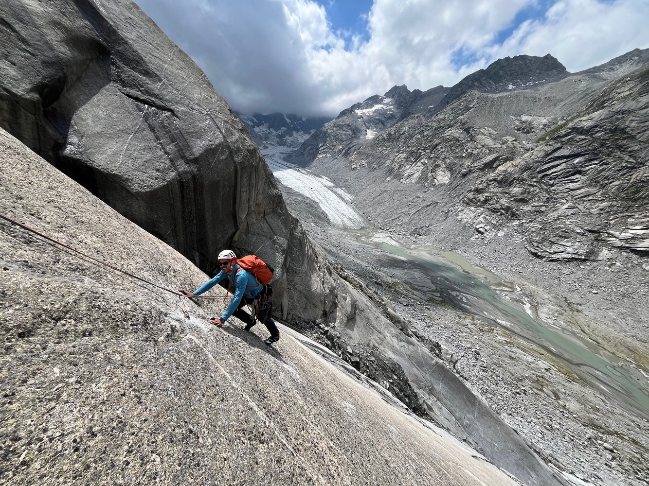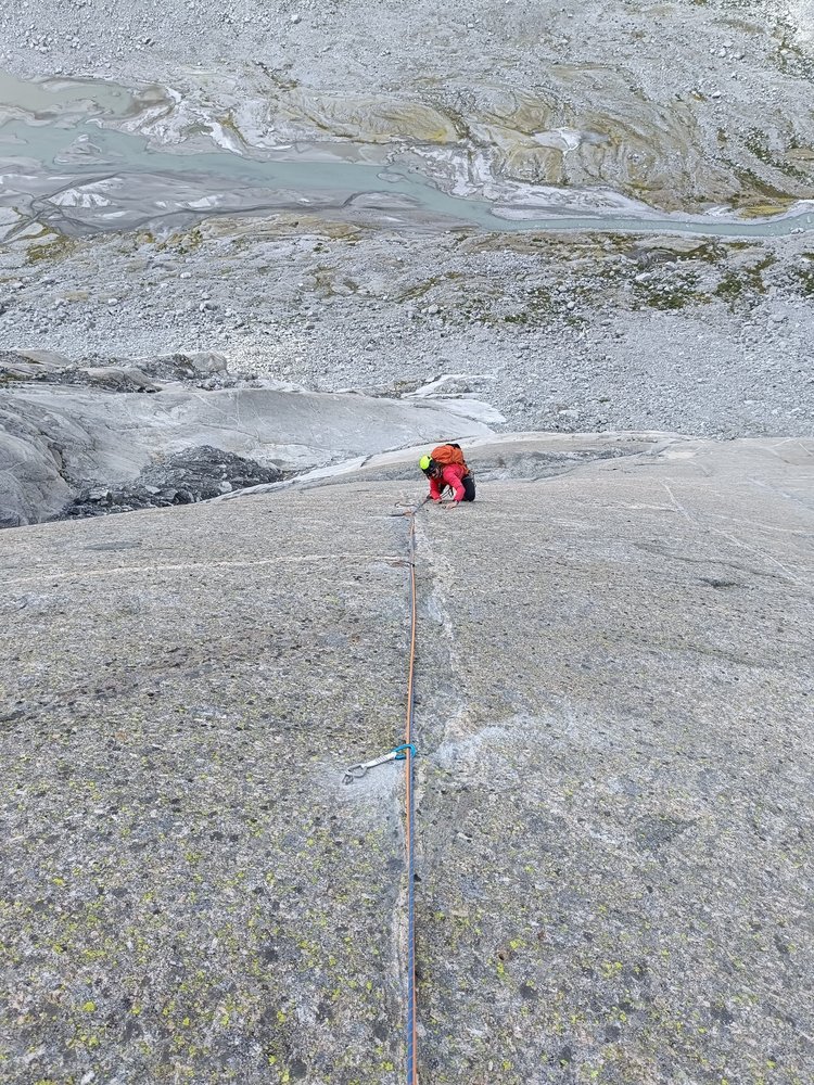 Eine lange in Vergessenheit geratene Linie, im Juli 2025 modern saniert und nun wieder lohnend begehbar. Die Plattenschuss folgt einer logischen Linie über Kristalladern, Verschneidungen, Reibungsplatten und feine Leisten – durchgehend abwechslungsreich und stimmig. Die durchgehend gute Absicherung macht die Plattenschuss auch für weniger Erfahrene gut machbar – und erlaubt das Panorama über Gletscher und Fornotal zu genießen. Die Platten trocknen auch nach starkem Regen sehr schnell und die Tour ist innerhalb weniger Stunden wieder kletterbar.