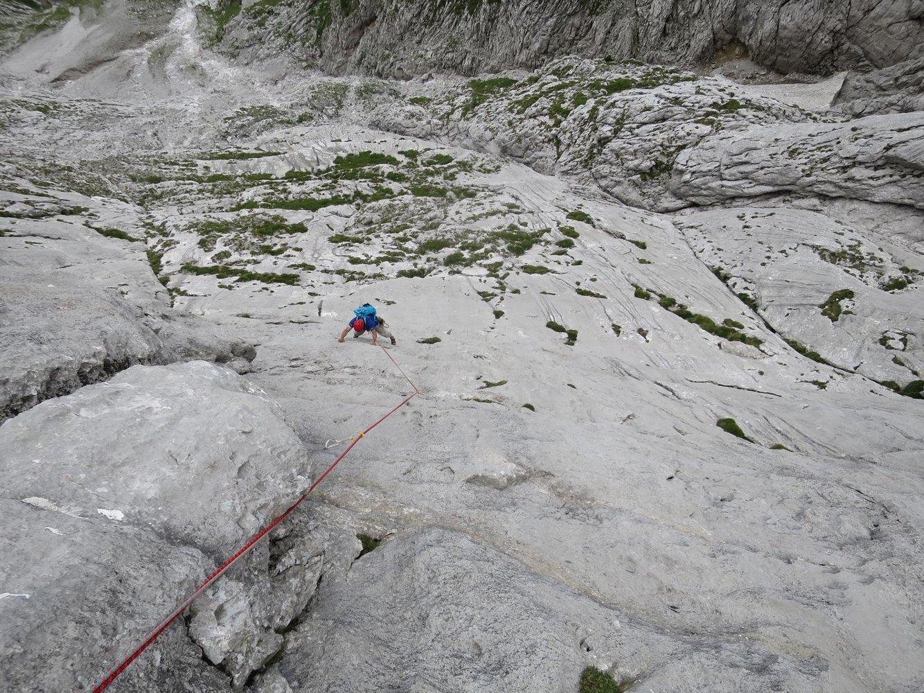 Die Tour ist an den wichtigen Stellen stets mit Bohrhaken abgesichert, dazwischen muss man aber oft zwingend weit klettern.