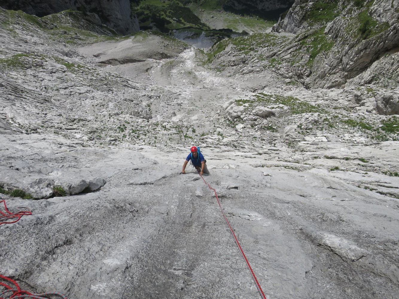 Sehr schöne Route im der tollen Plattenwand des Festkogels im Nationalpark Gesäuse. Die Tour geht zwischen den Routen Von Teufels Hand und Fahrt ins Blaue hinauf und bietet durchswegs sehr gute Kletterei im überwiegend 5ten Grad, den man aufgrund der wenigen Bohrhaken aber ganz sicher klettern sollte, da eine zusätzliche Absicherung mit Keilen und Friends in der Plattenwand oft schwierig ist. Die Bolts sind nach der Sanierung aber in gutem Zustand und die Kletterei sucht hinsichtlich Schönheit ihresgleichen.