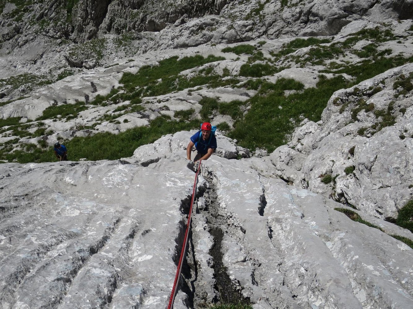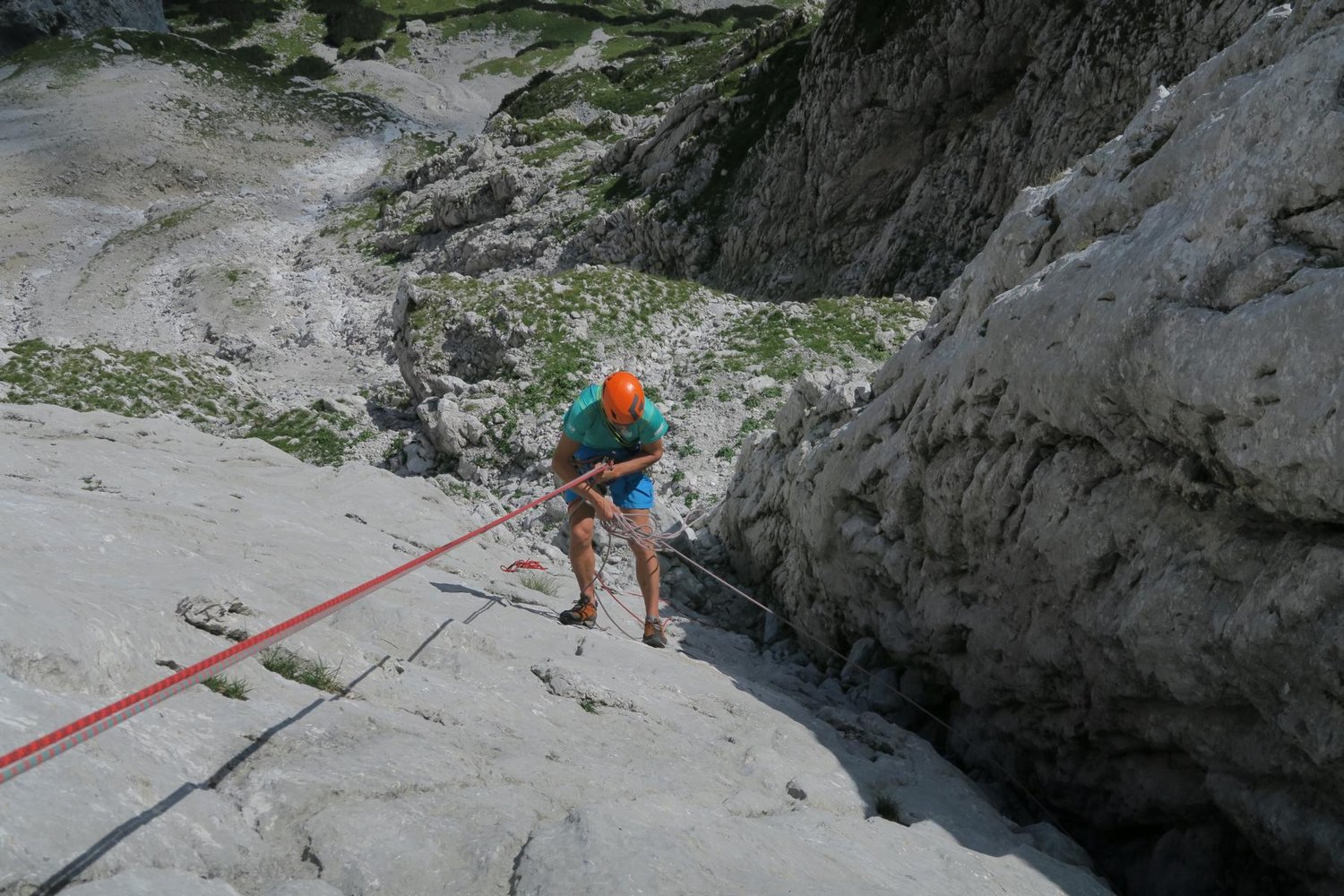 2. Abseilen: Vom Ausstieg den Grat nach links absteigen, bis man in die Rinne zwischen Östeinkarturm und Festkogel kommt (klettern bis 2). Durch die Rinne weiter hinunter auf das große Grasband und von dort über die Abseilpiste (Kettenstand nach einem flachen Block) 8x25 oder 4x50 zum Einstieg runter und orographisch links (über den einzelnen Baum!) zum Einstieg des Vorbaus hinunter (1-2). Bei Nässe absolut gefährlich, da senkrechtes Gras!!! (3 Std.)
