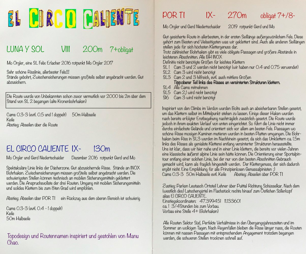 Logische Linie in allerbestem, in der ersten Seillänge außergewönlichem Fels. Diese gehört zum Besten und Vielseitigsten was die Erstbegeher bis dato geklettert sind. Auch alle anderen Seillängen stellen jede für sich höchsten Klettergenuss dar. Sehr vielseitige anhaltende Allroundkletterei in Platten und Rissen mit der ein oder anderen athletischen Passage. Eine spannende Herausforderung für On-Sight Anwärter.
