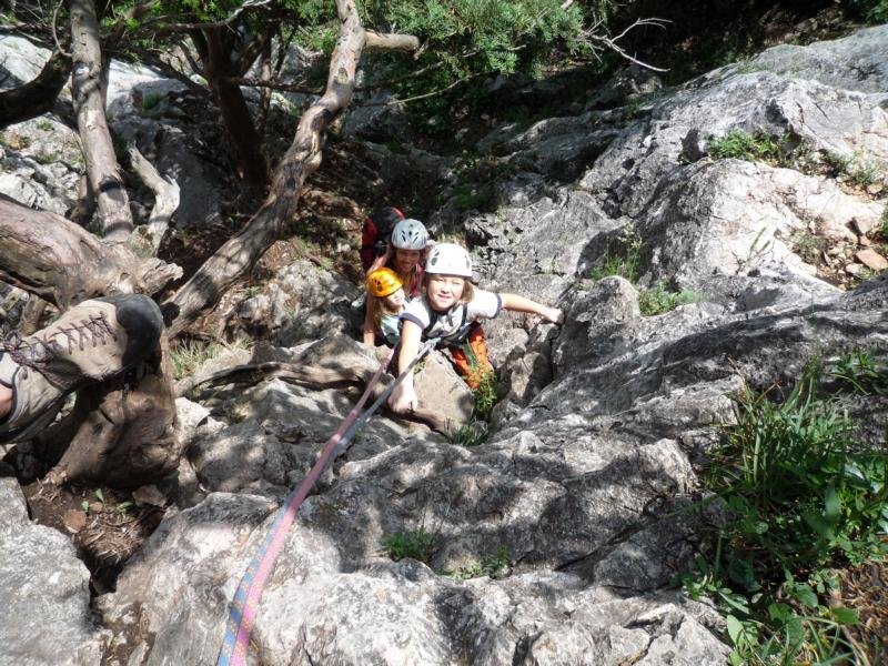 Eigentlich erst aber der Querung oben unter der kleinen Postlwand mit eineigen Haken und Sanduhren versehen. Siehe dazu Topo Postlgrat!