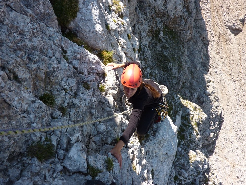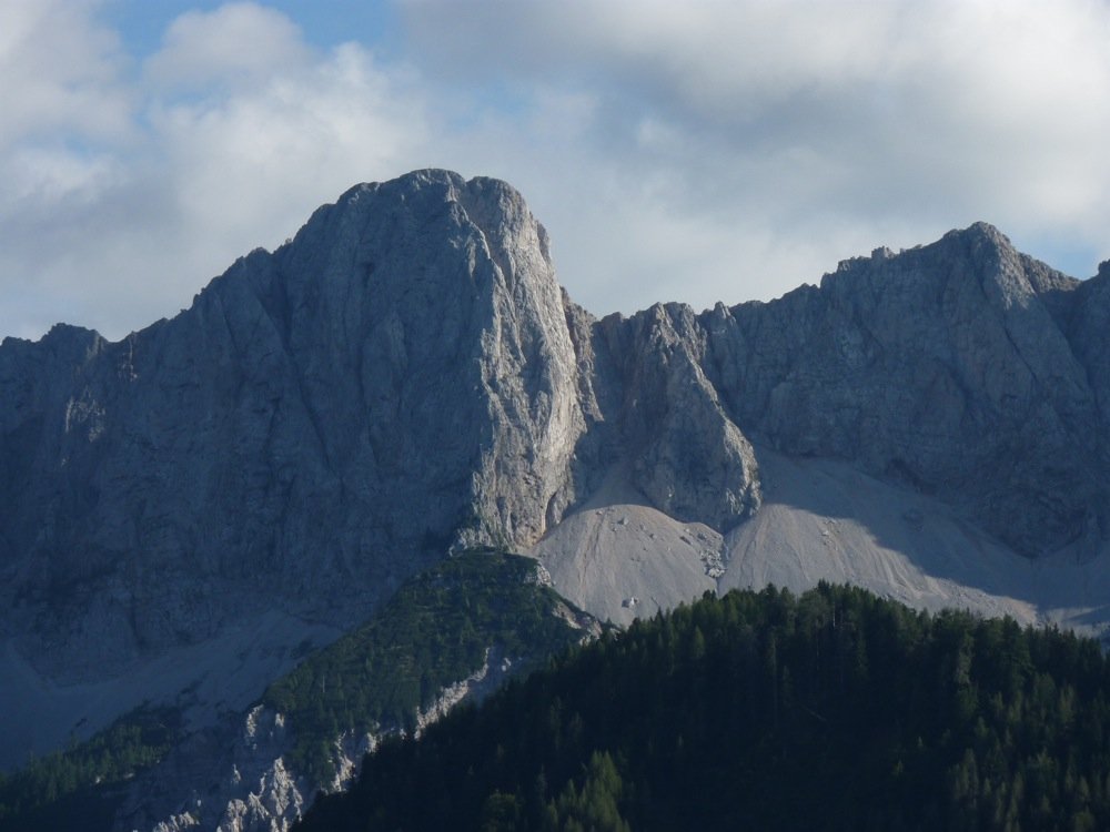Die Pretterebner zu beschreiben ist so eine Sache. Der untere Teil bis zum “Oberen Quergang” ist ganz gut (die zweite Seillänge ist ziemlich eindrucksvoll, dafür ist die dritte Seillänge recht brüchig) und auch saniert. Der obere Teil der Pretterebner wird hier nicht beschrieben, da dieser Teil saubrüchig und schwer absicherbar ist. Aus diesem Grund wird deshalb die Routenkombination aus “Pretterebner” im unteren Teil, “Karantanien2000” im mittleren Wandabschnitt und “Westkante” ganz oben beschrieben. So ergibt sich eine großzügige meist gebohrte Route im mittleren Schwierigkeitsgrad in meist festen, manchmal jedoch auch etwas brüchigem Fels durch die gesamte Wand.