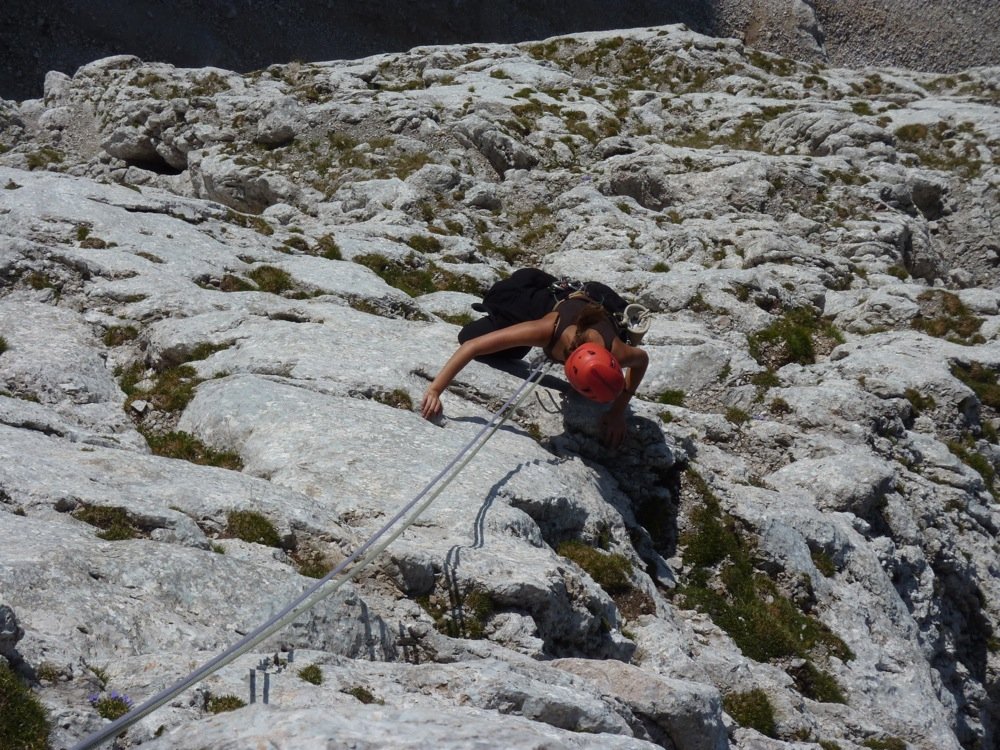 Vom Ausstieg 10m zum markierten Steig und auf diesem (5-10min) nach Westen absteigen bis zu einer Scharte. Einige Meter aufwärts zum Beginn des ÖTK-Klettersteigs bei einer blauen Tonne. Über den Klettersteig (B bzw. B/C) hinab und über das Schotterfeld zurück zum Einstieg. Weiterer Abstieg wie Aufstieg.
