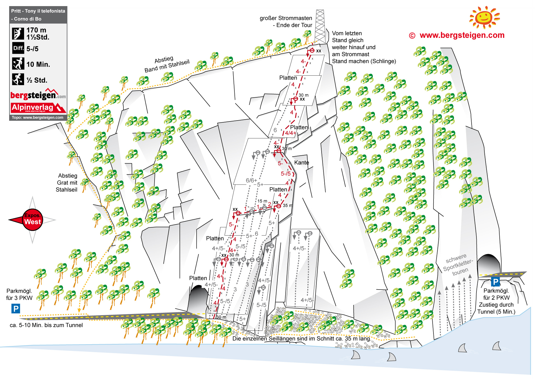 Siehe Topo. Der leichteste Aufstieg zum großen Strommasten ist die Route Pritt (zwei Seillängen bis auf das Band) und die oberen drei Seillängen der "Tony il telefonista" (diese Kombination ist im Topo in Rot eingezeichnet).