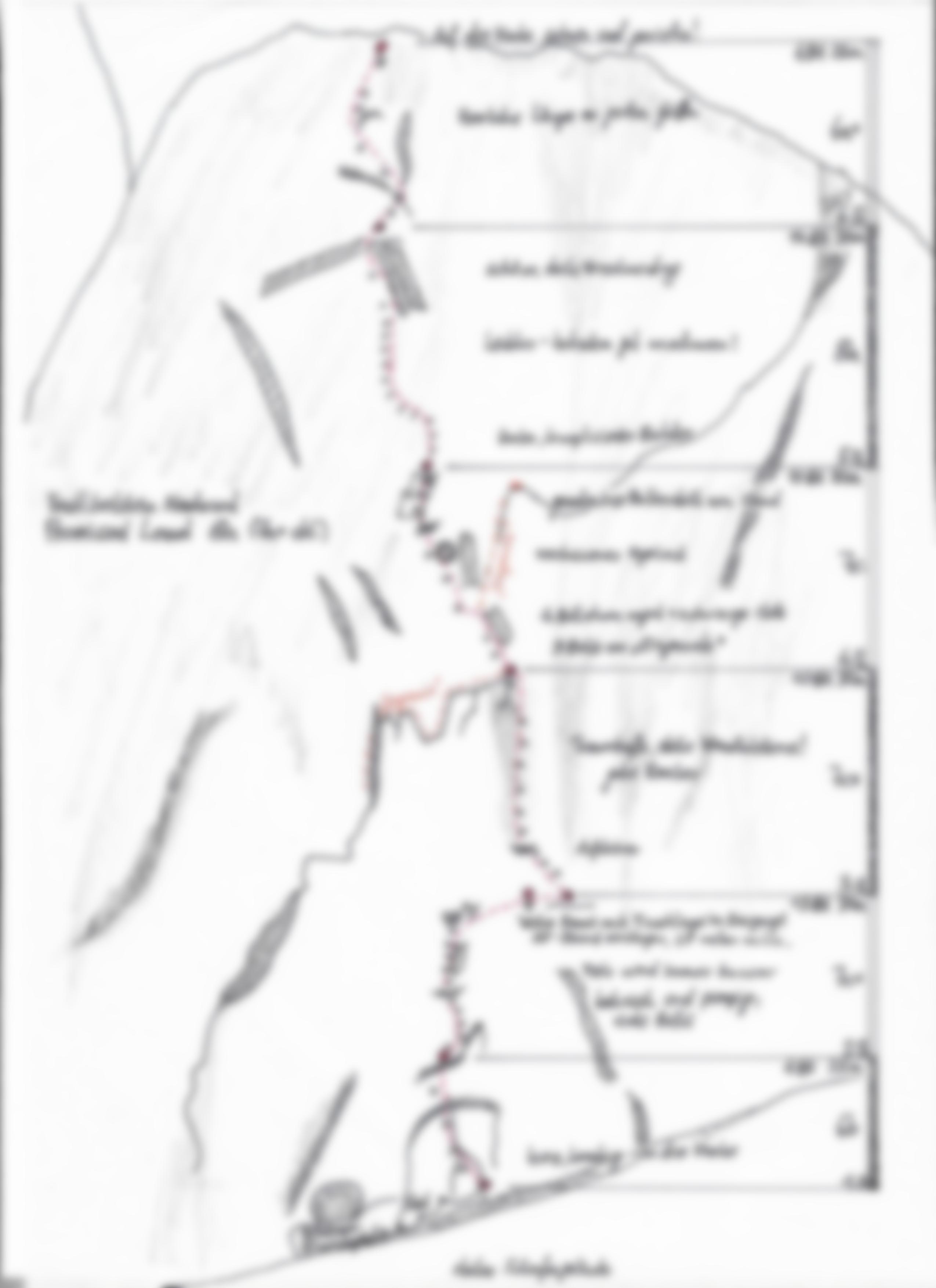 Variante1: Weiter unter der Wand durch, bis man am linken Rand den Wandfuß einfach erreicht. Am Wandfuß nach rechts queren, bis zum schönen Biwakplatz mit Höhle. Fixseil führt nach rechts ums Eck zum Einstieg.