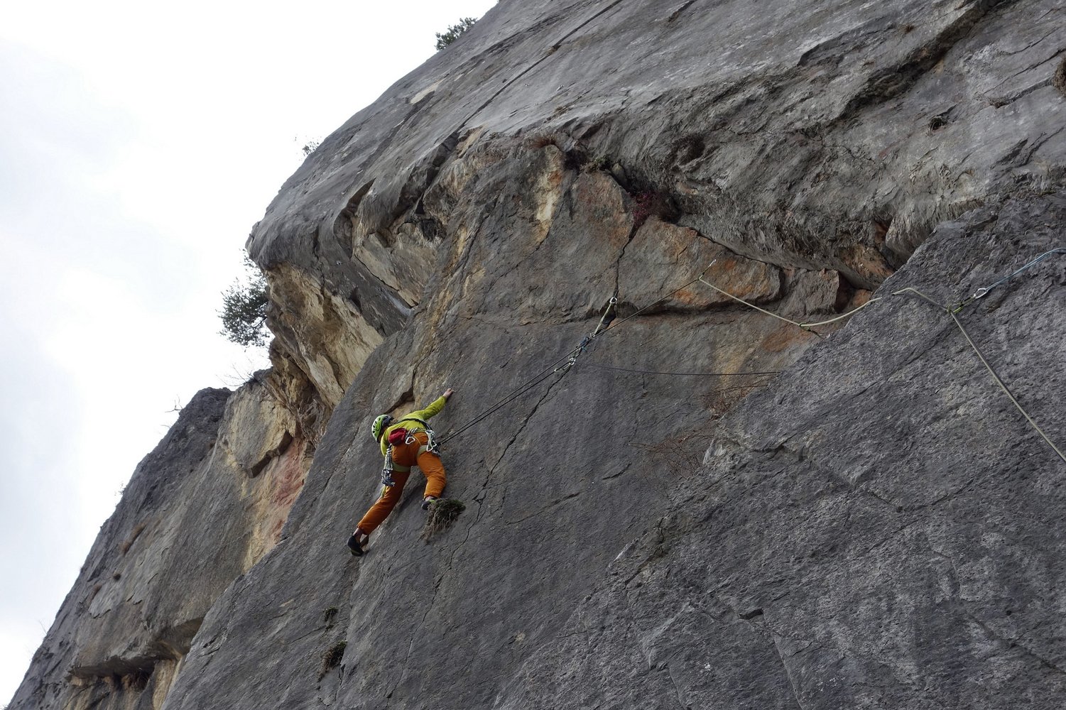 Zuerst leichte, aber brüchige Kletterei, in der Platte dann delikate Bewegungen über gute Sicherungspunkte an nicht immer ganz festem Fels.