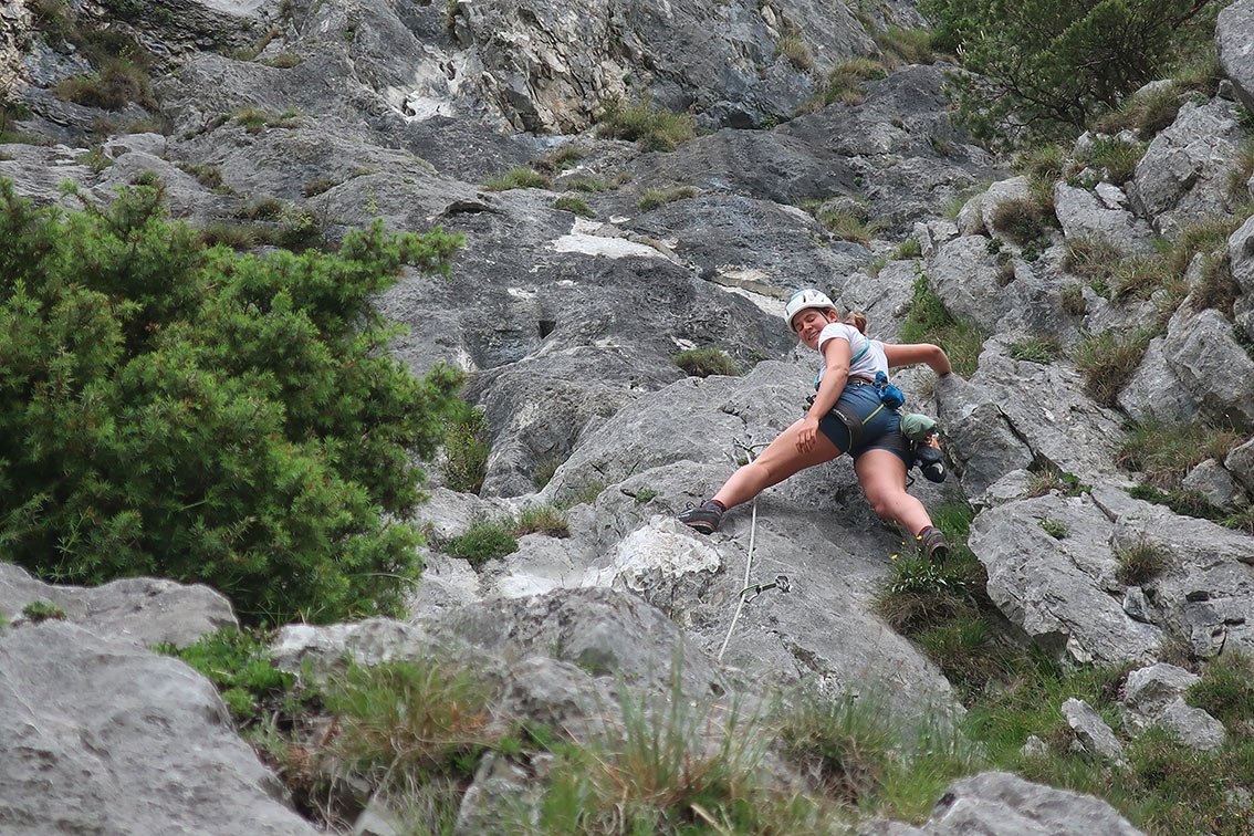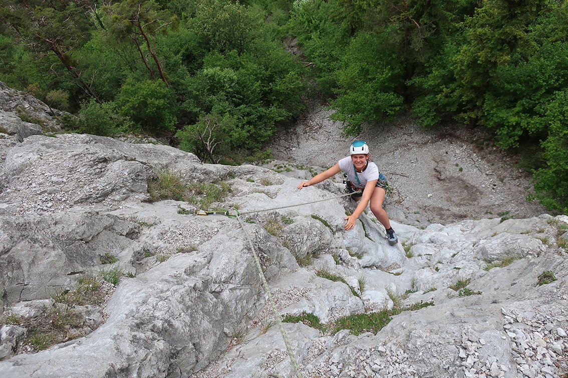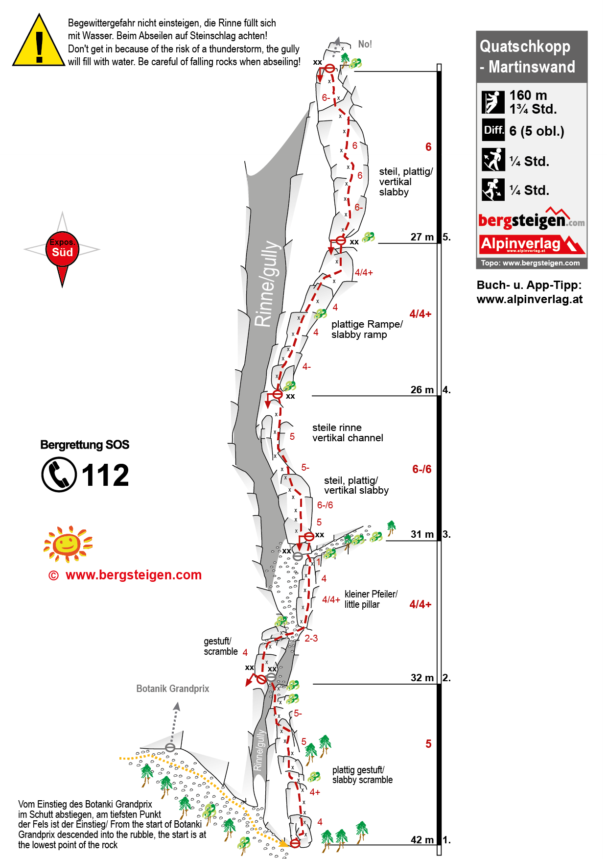 Achtung: Beim Abseilen und Klettern im Bereich der zweiten Seillänge auf Steinschlag achten - man quert dort die mit viel Schutt gefüllte Rinne!