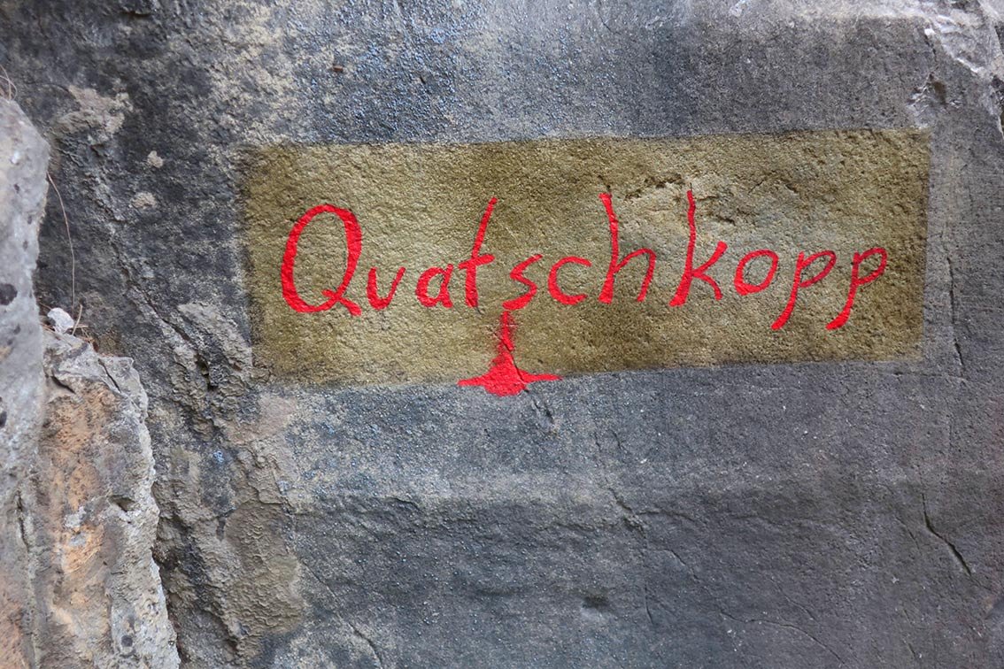 Die Route Quatschkopp ist eine gelungene Mehrseillängeroute am Sockelvorbau an der Zentralen Martinswand. Die Route verläuft im Bereich einer riesigen "Regenrinne" und endet noch vor dem überhängenden Wandteil. Die gutmütige, gut abgesicherte Kletterei bietet immer wieder nette Kletterstellen und mit der letzten kompakten Seillänge kommt das Highlight in Sachen Felsqualität.