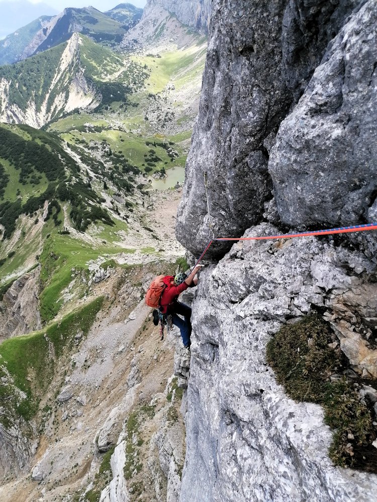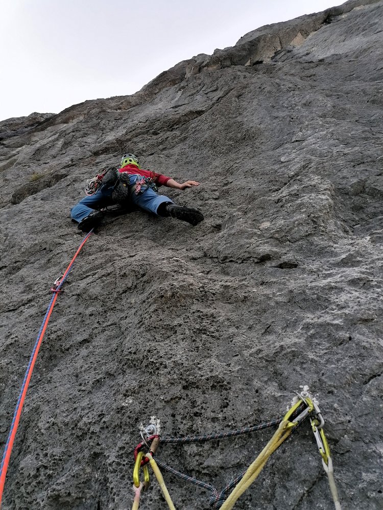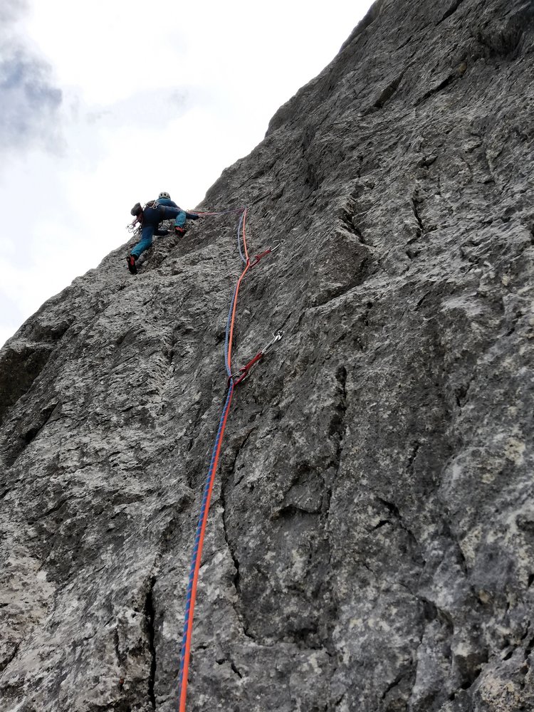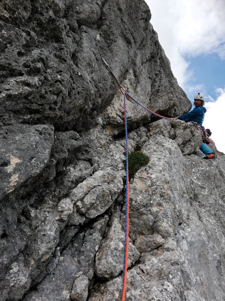 - Seillänge 10: "Götterquerung": Ohne zu viel zu verraten: Für uns war dies die Brücke zur Ewigkeit, eine Passage, die an Intensität und Exponiertheit kaum zu übertreffen ist. (4 lange „Alpin-Exen“ notwendig um die Seilreibung zu reduzieren)