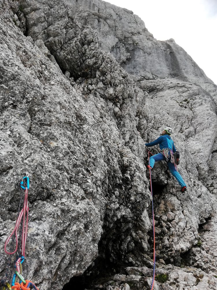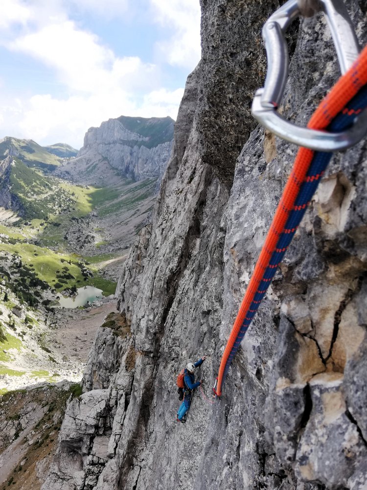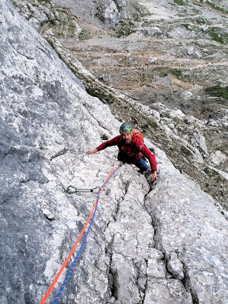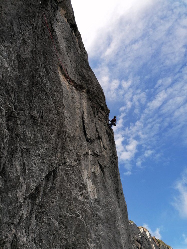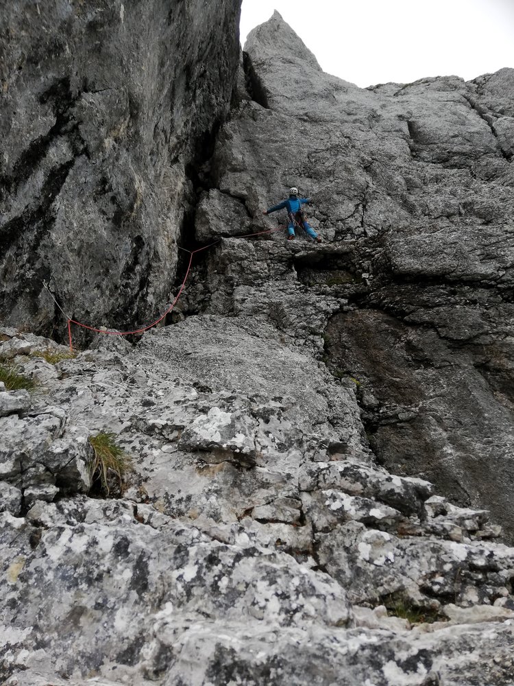 - Seillänge 10: "Götterquerung": Ohne zu viel zu verraten: Für uns war dies die Brücke zur Ewigkeit, eine Passage, die an Intensität und Exponiertheit kaum zu übertreffen ist. (4 lange „Alpin-Exen“ notwendig um die Seilreibung zu reduzieren)