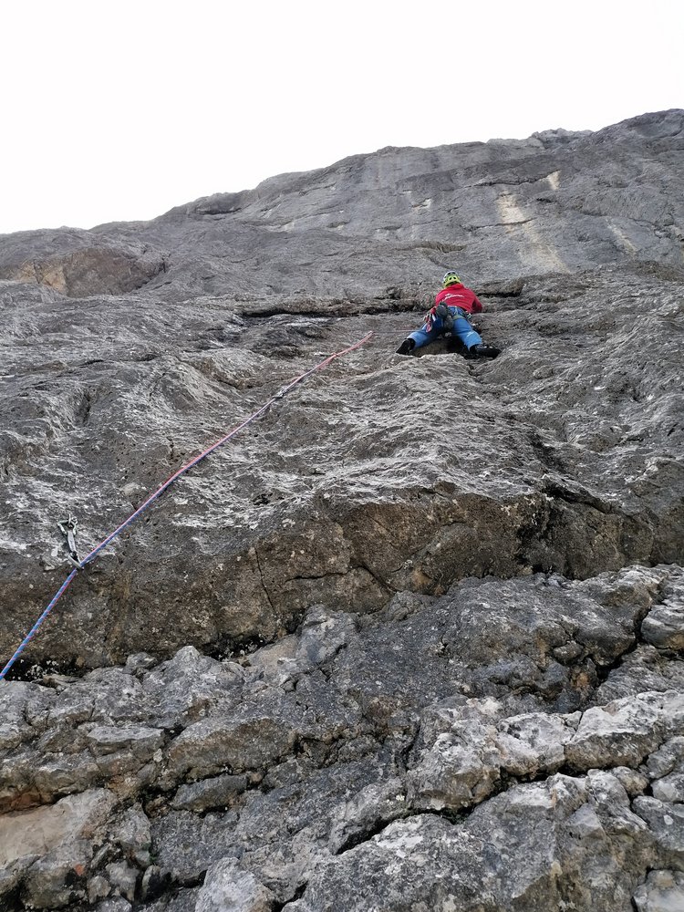 E2-: Aufgrund der Querung in SL 3&4, einem etwas weiteren Abstand im leichteren Grad in SL 5 (kann mit mobiler Sicherung entschärft werden) und dem alpinen Charakter und Absicherung in SL6, wobei diese in gutem Zustand sind. Ansonsten ist die Route eigentlich E1+