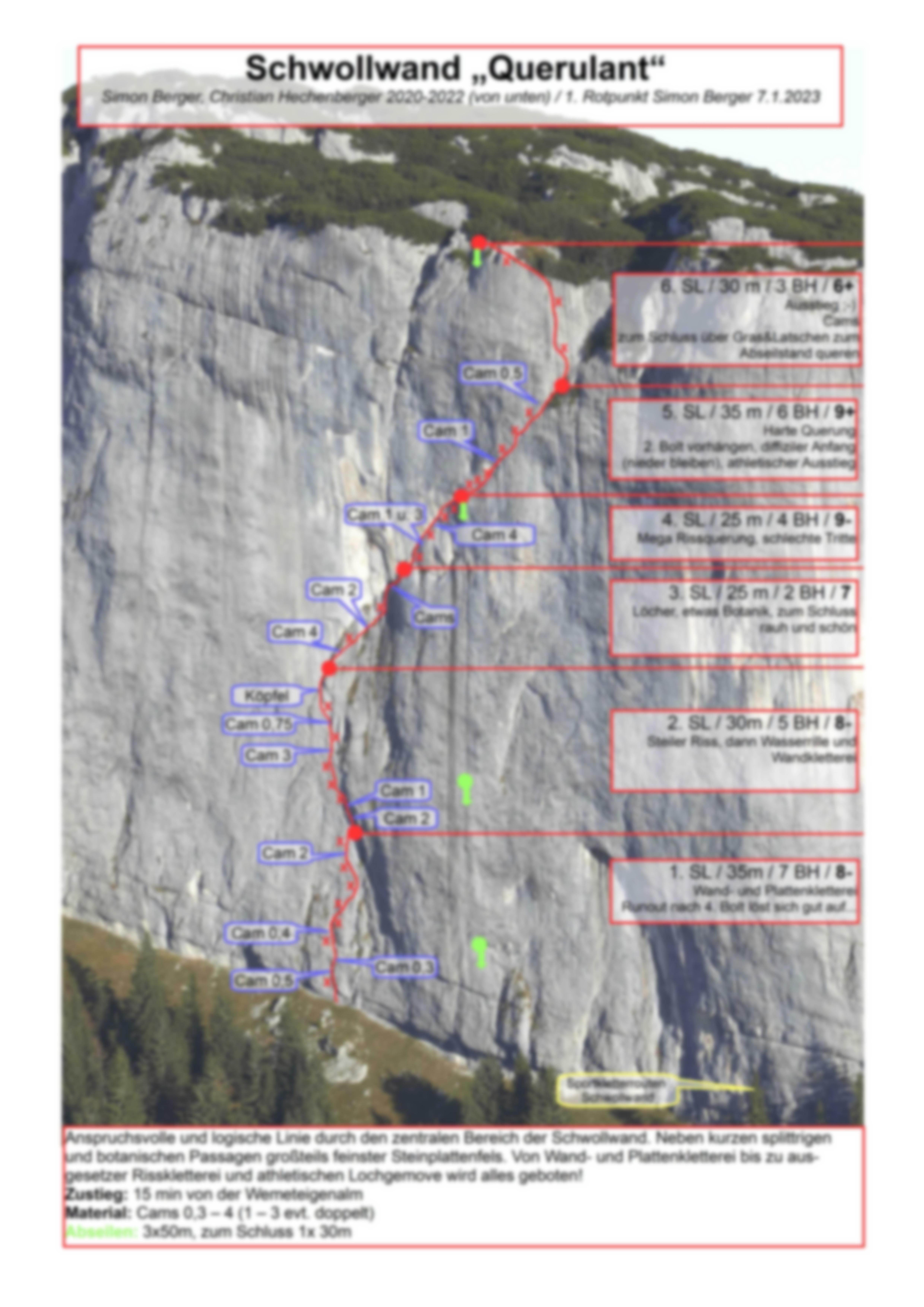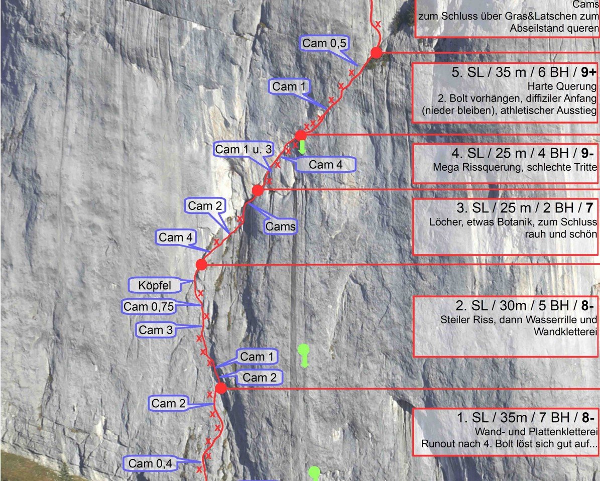 Anspruchsvolle und logische Linie durch den zentralen Bereich der Schwollwand. Neben kurzen, splittrigen und botanischen Passagen großteils feinster Steinplattenfels. Von Wand- und Plattenkletterei bis zu ausgesetzter Risskletterei und athletischen Lochmove wird alles geboten.
