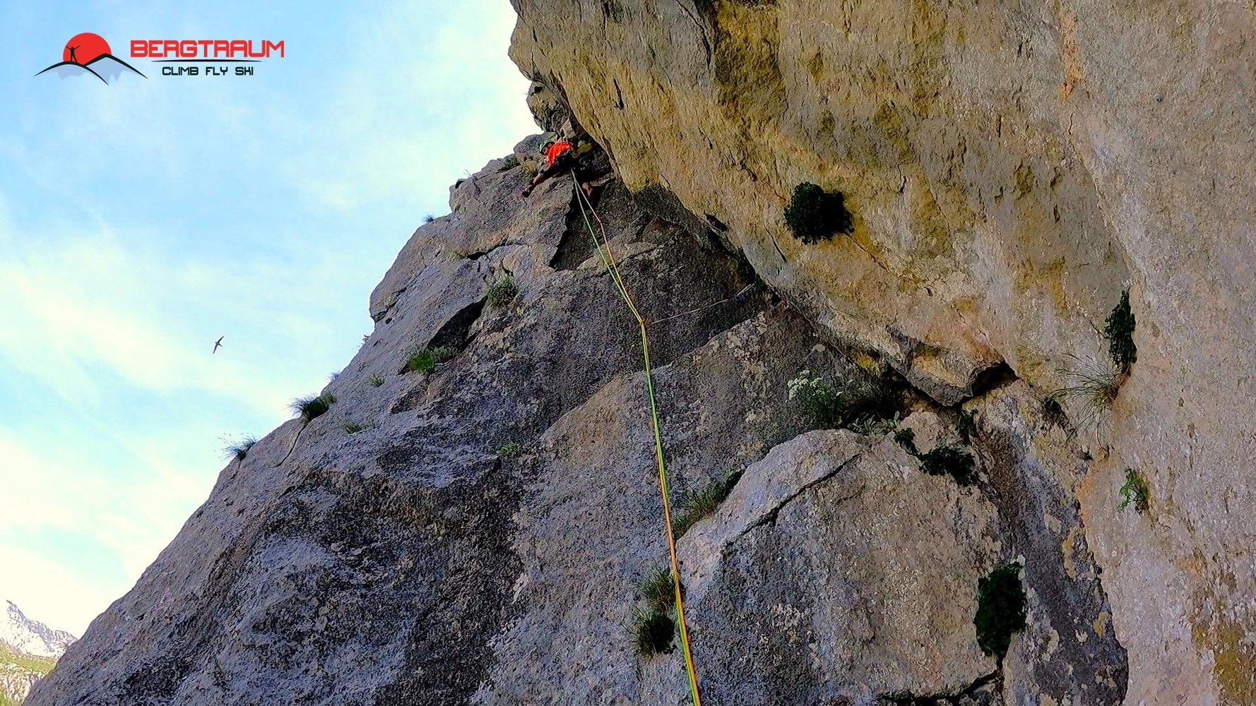 L2- 6b+: Etwas grasige Länge durch eine steile Verschneidung hinauf.