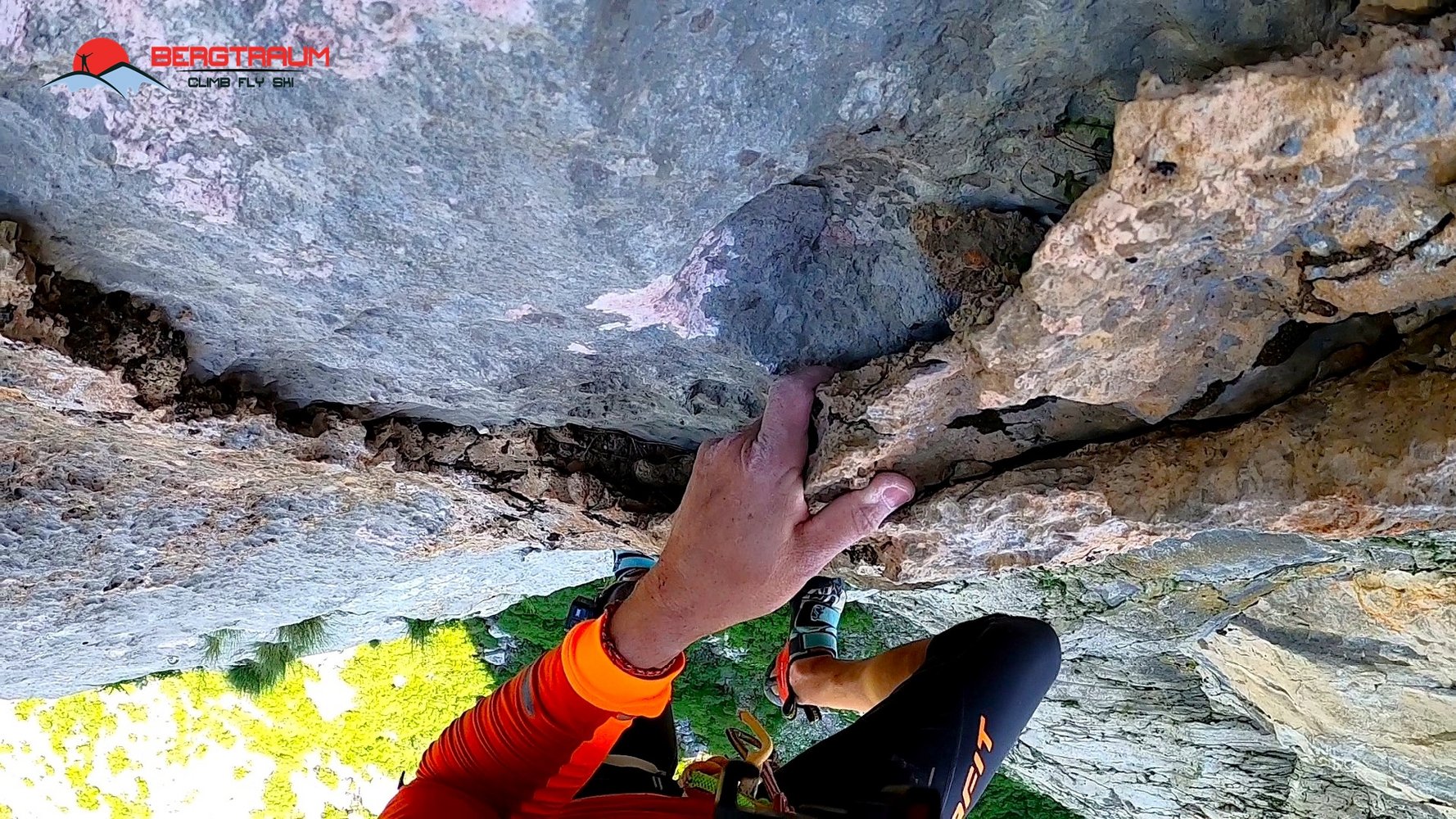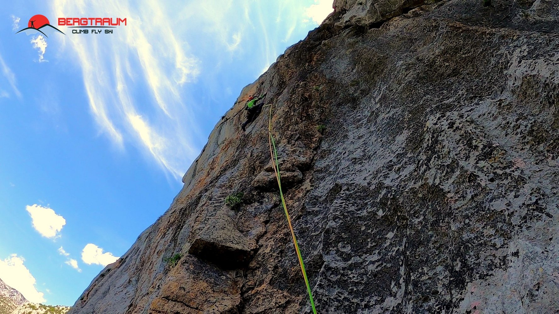 Die Tour wurde mit wenigen bolts von den Remy- Brüdern von unten eingerichtet. Die Risse und Verschneidungen sind selbst abzusichern. Die Schlüsselstelle ist ein harter Boulder in „gewußt wie“- Manier. Genau dort steckt aber ein beruhigender bolt.