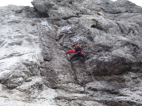 Entweder ueber die Abseilpiste 100 m links von der Route 5 x 40 m oder ueber das G`hackte (in suedlicher Richtung) zum Aufstiegsweg und diesem zum Bodenbauer folgen.