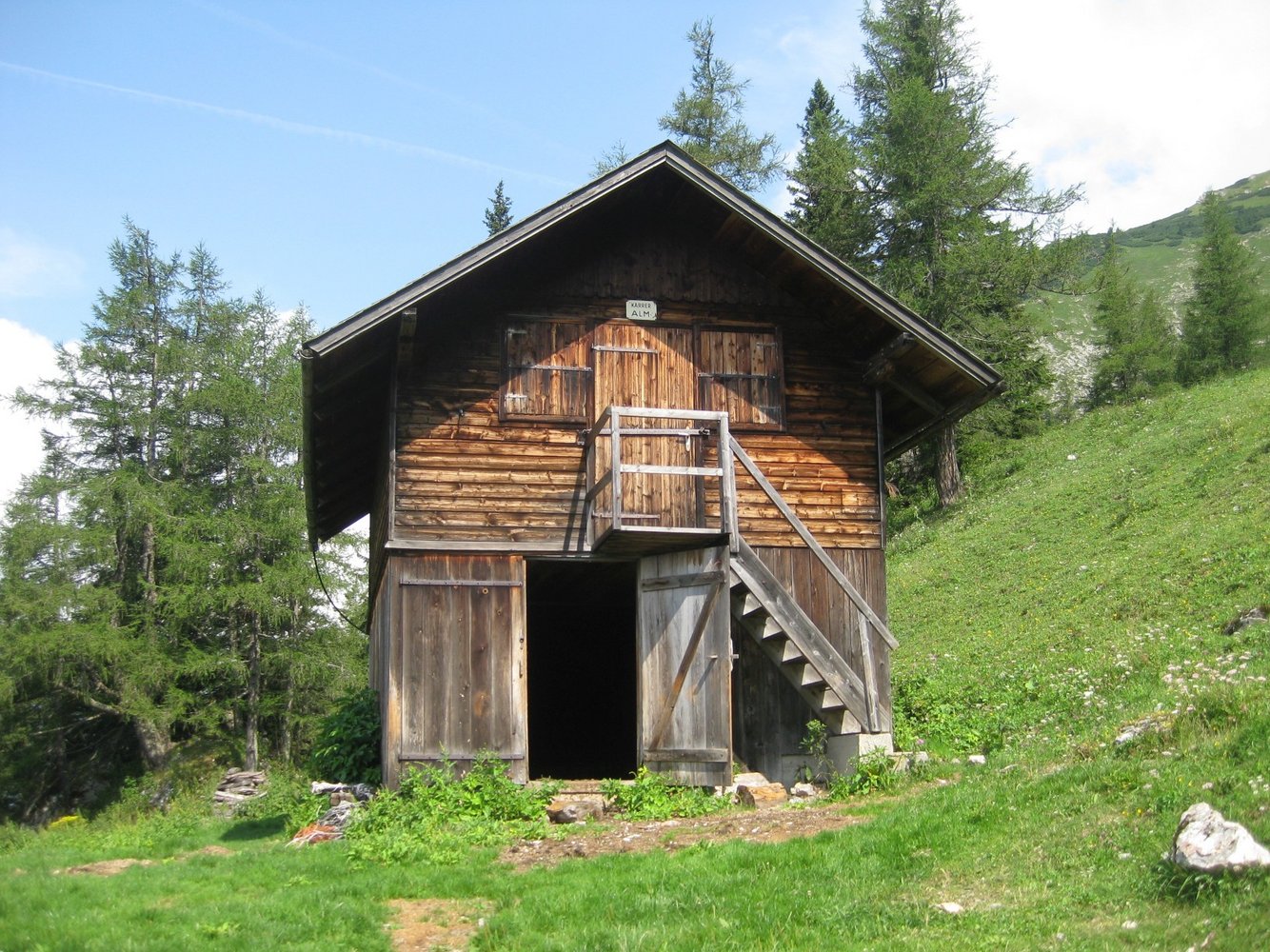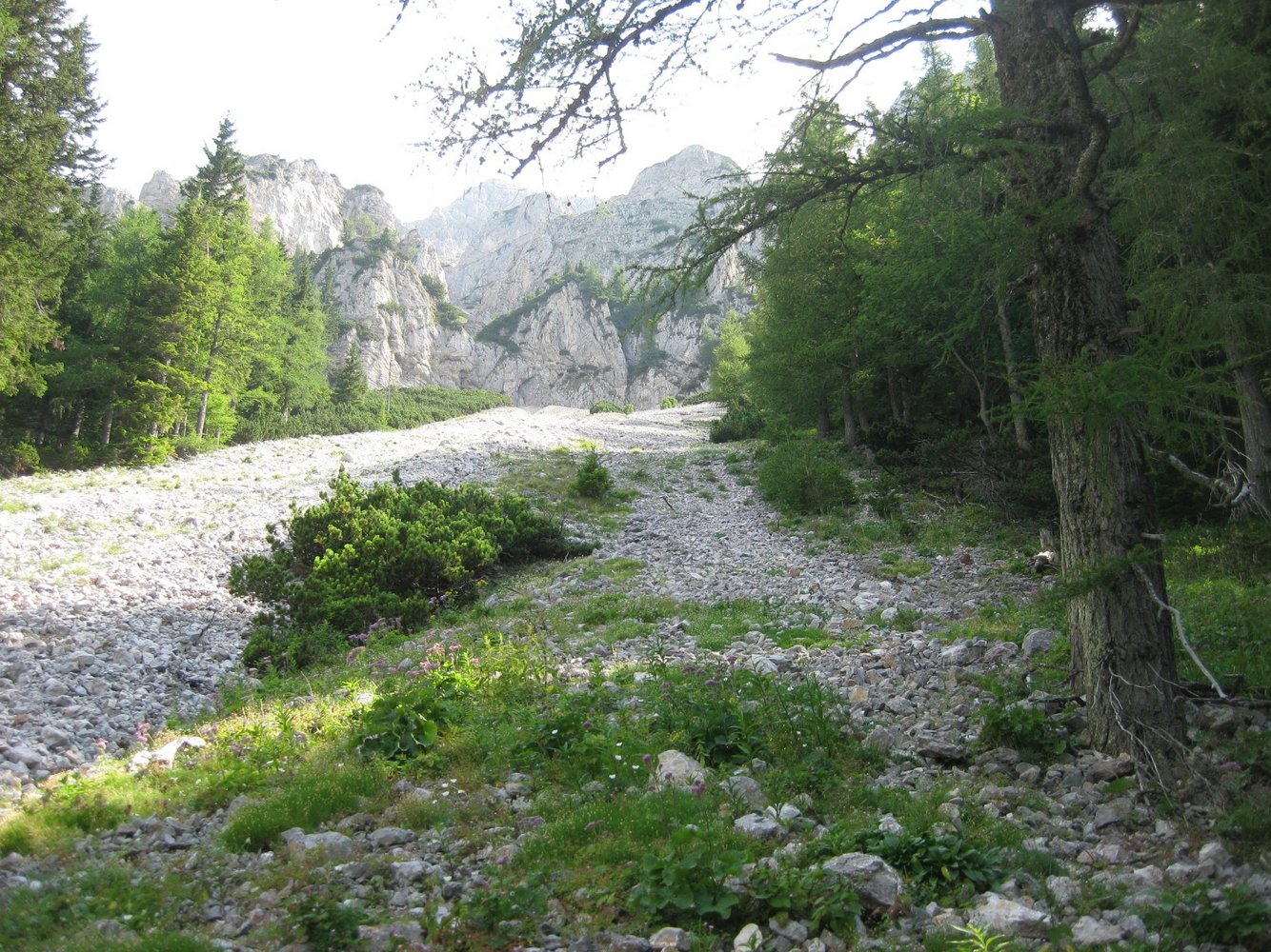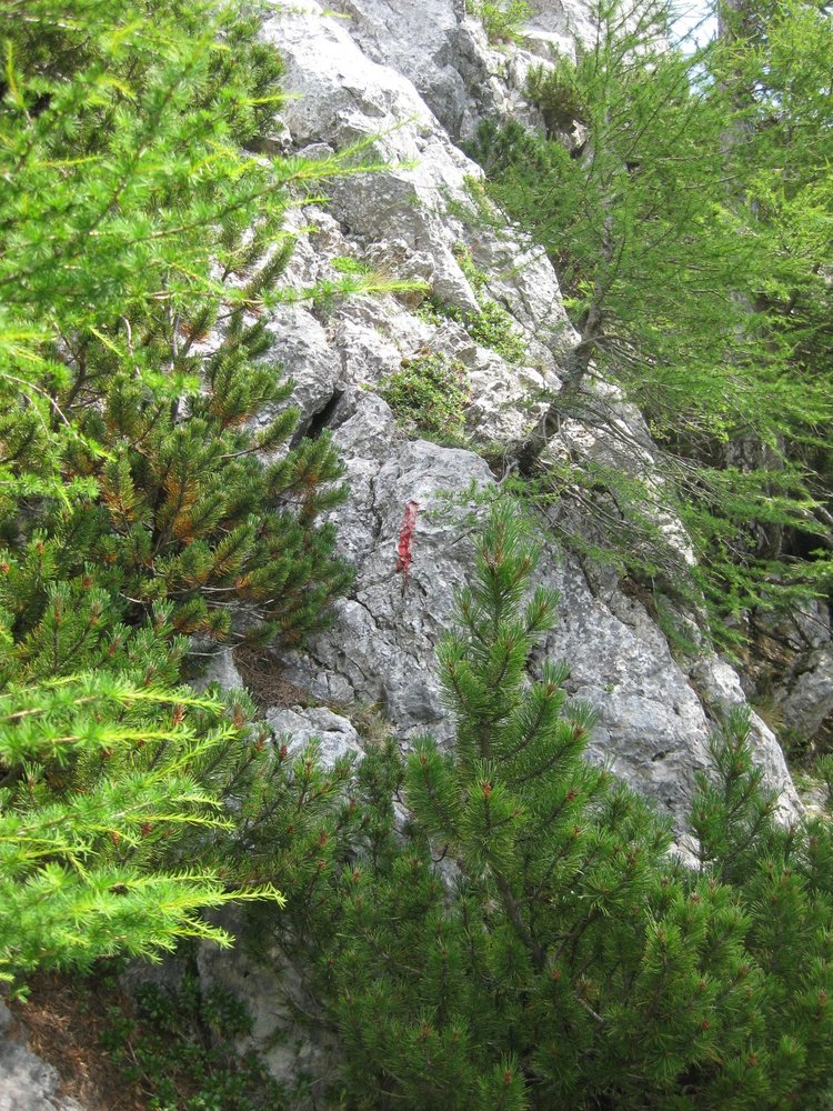 Vom Gasthof Moassa auf dem markierten Weg zur Karreralm (1477m). Achtung, erst die letzte Forststraße nach links nehmen! Von hier Richtung Fuchslochsteig bis zum ersten Schotterfeld. Am rechten Rand 100m aufwärts, bis ein kleines Steiglein nach rechts in den Wald führt. Das nächste kleine Schotterfeld rechtshaltend überqueren und zum tiefsten Punkt der Felsen. Hier Einstieg beim Beginn des kleinen Felsgrates (rote Markierung, ca. 1550m).
