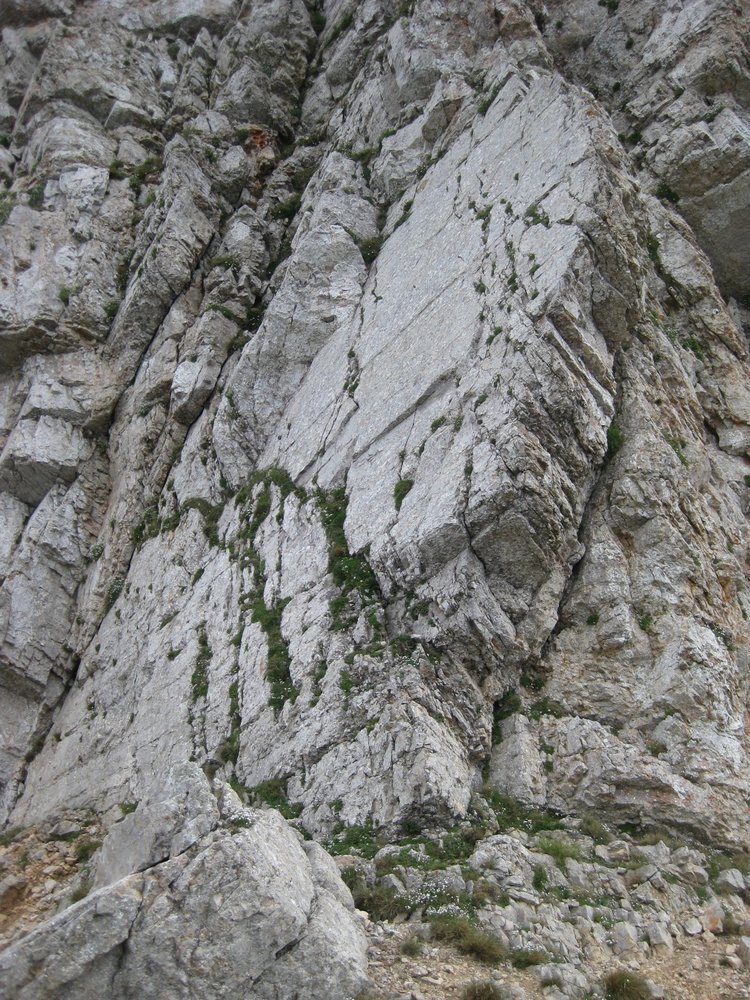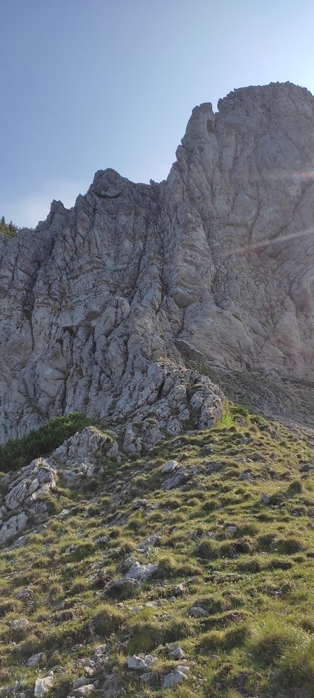 Die Linie führt recht logisch über Gratabschnitte und Schrofenrücken, einige kleine Türme werden dabei umgangen. Die Schwierigkeiten bewegen sich meist im 1. Grad, zu Beginn ein paar nette Zweierstellen und eine 5m lange Platte im 3. Grad, die nicht besonders ausgesetzt ist.