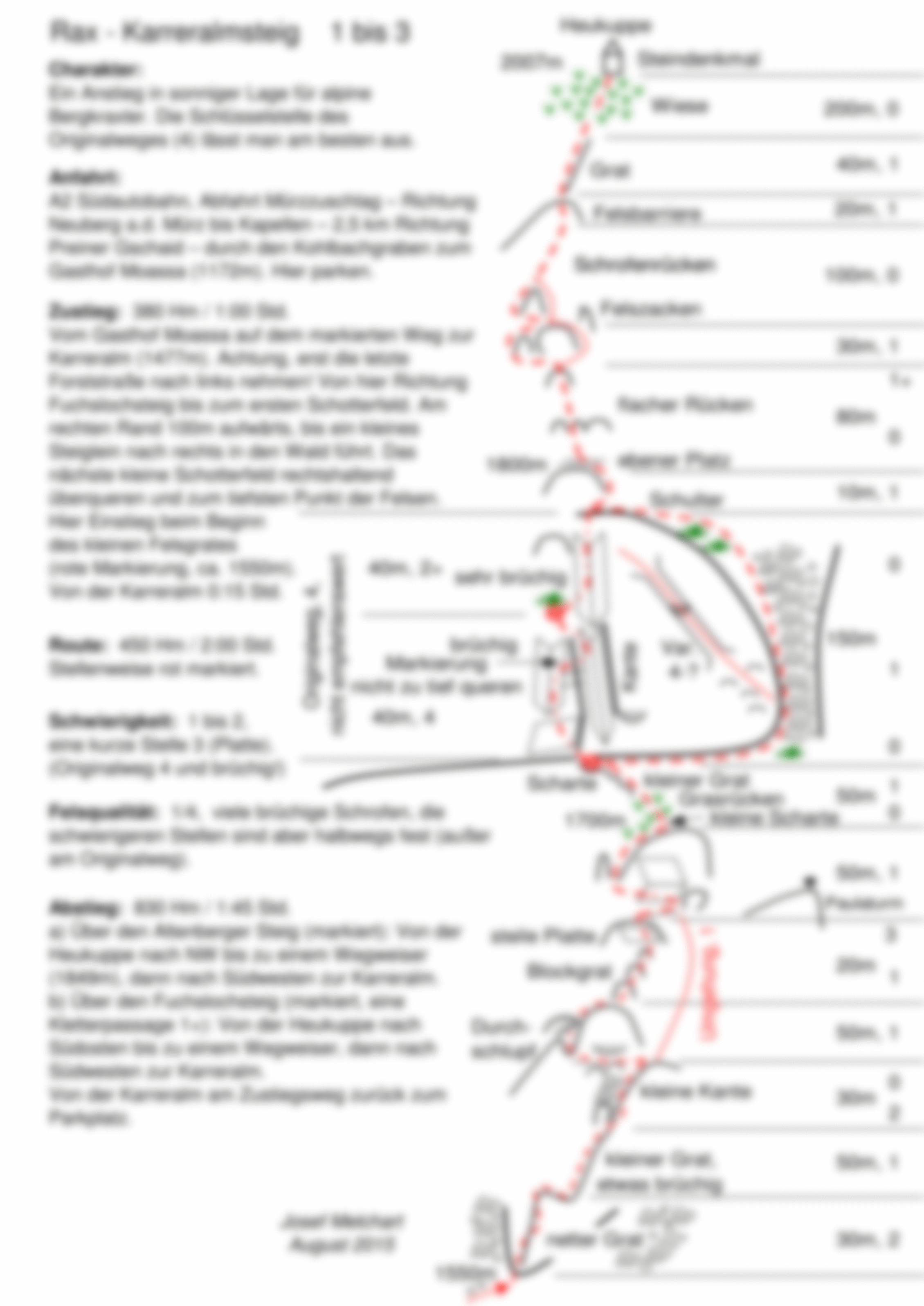 Ein Anstieg in sonniger Lage für alpine Bergkraxler, die sich gern seilfrei im leichten Fels bewegen. Mehr Berg- als Klettertour. Dieser Weg sucht sich die schönsten Gratpassagen durch den einsamen Wandbereich der Raxenmäuer und führt direkt zur höchsten Rax-Erhebung, der Heukuppe. Die schwierigeren Stellen weisen durchaus festen Fels auf, meist steigt man jedoch über leichtes brüchiges Felsgelände und Schrofen bergauf. Die Schlüsselstelle des Originalweges (4) lässt man am besten aus.
