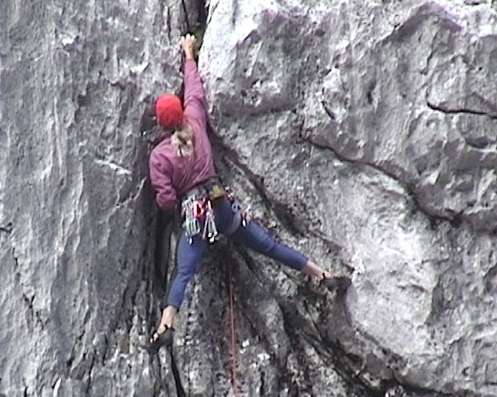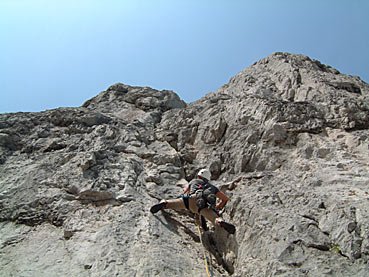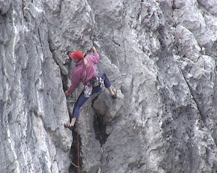 Schöner Klassiker durch die Fleischbank Ostwand, der Anstieg wurde mit Bohrhaken saniert und ist somit wieder einen Besuch wert. Im unteren Teil wurde etwas üppiger saniert, im oberen leichteren Teil wird aber noch alpiner Spürsinn verlangt, die Haken stecken meist weit auseinander. Die Route läßt sich aber oben mit Keilen sehr gut absichern und an den schweren Stellen stecken immer Klebehaken. Man muß nach Bewältigung der 2ten Seillänge nur überlegen, dass die Erstbegeher mit Normalhaken und Holzkeilen erfolgreich waren....!