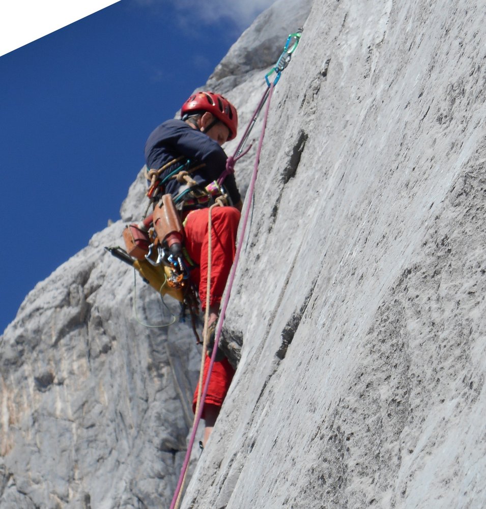 Alpine Sportklettertour mit etwas längeren Hakenabständen im leichteren Gelände bis ca. VI+! Die Route verläuft durch die rote Dachzone in der Hochkönig Südwand. Rückzug überall möglich!