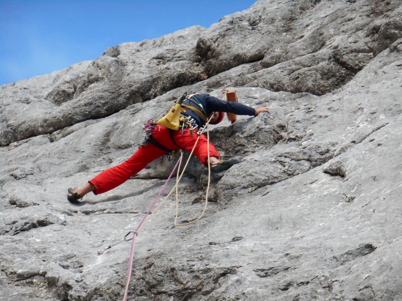 Alpine Sportkletterei mit obligaten Stellen bis ca. VII/VII+. Gleich nach dem ersten Stand eine A0/A1 Stelle (frei ein sehr schwerer Boulder ca. IX) Eine Stelle VIII/VIII+ in der 4 SL. Sonst oft bis ca. VI+/VII-...